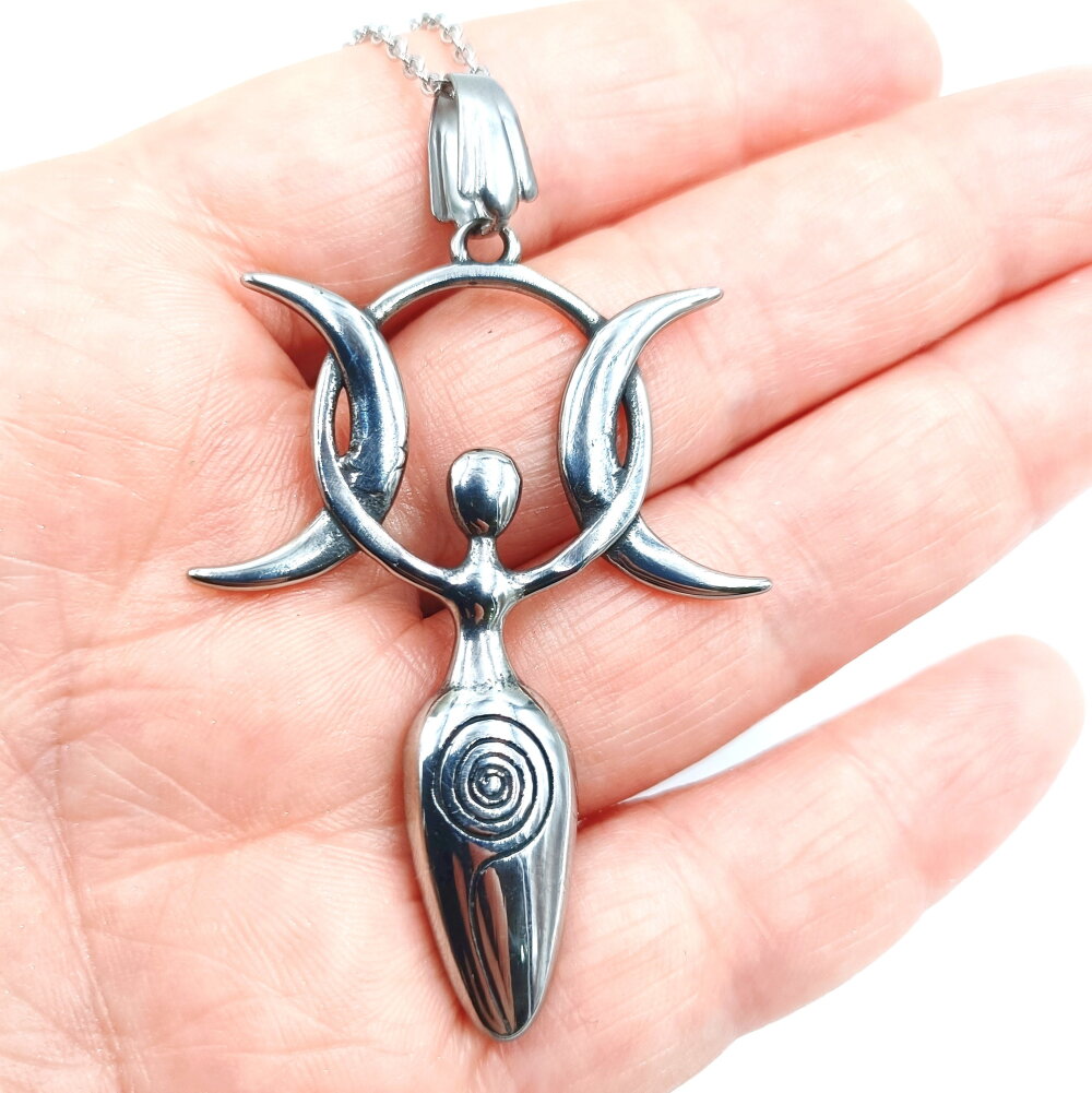 Collier Femme Déesse Fertilité Triple Lune. Pendentif Acier Inoxydable 304 couleur Argent.