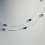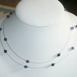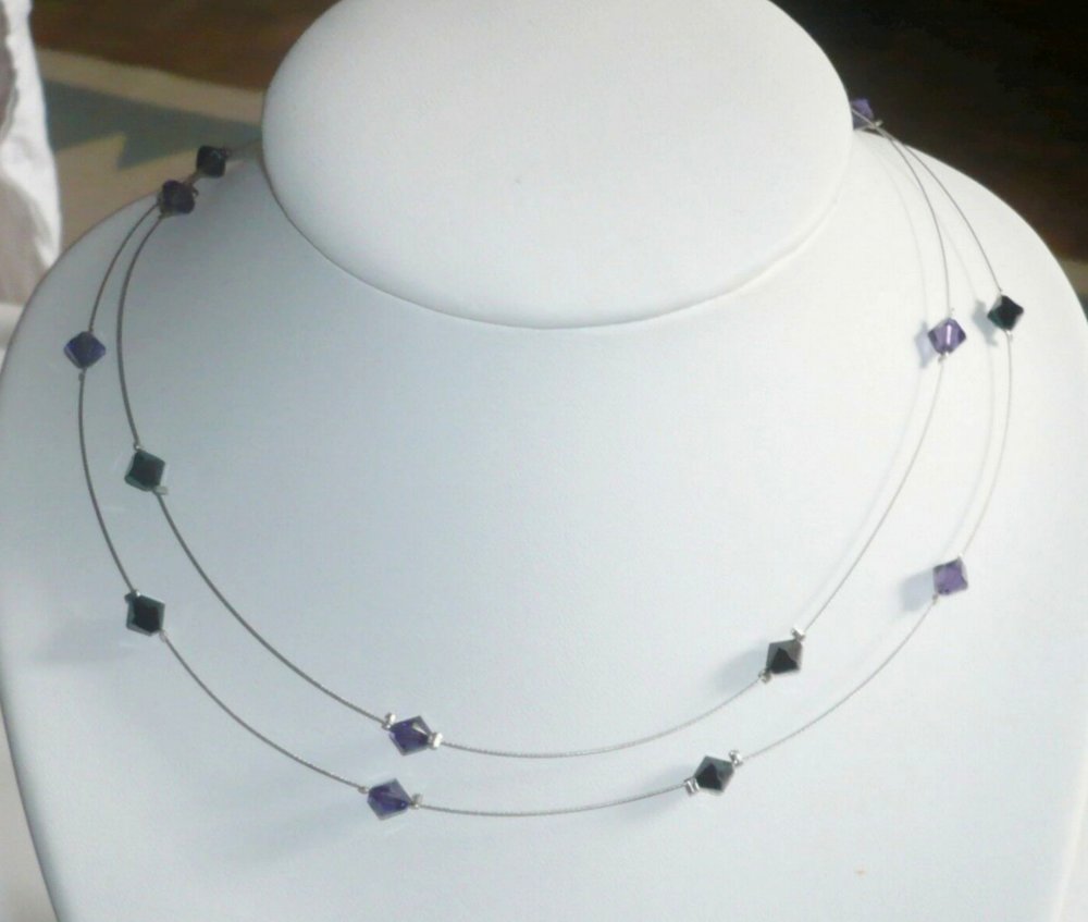 Fabriqué à la main, les bijoux sont surtout fait avec du fil câblé ou nylon, les perles sont en cristal de swarovski, verre de bohème.