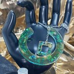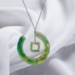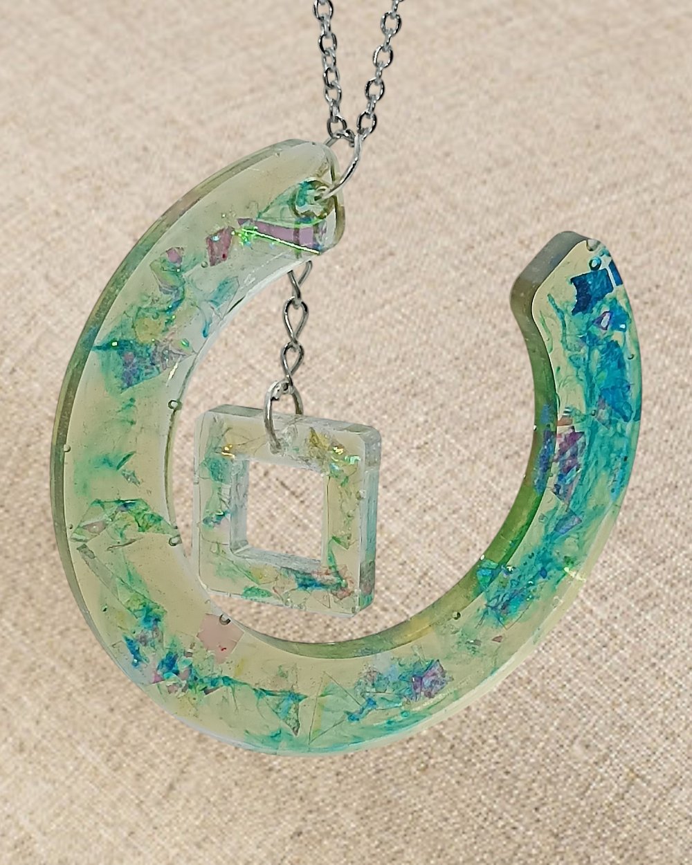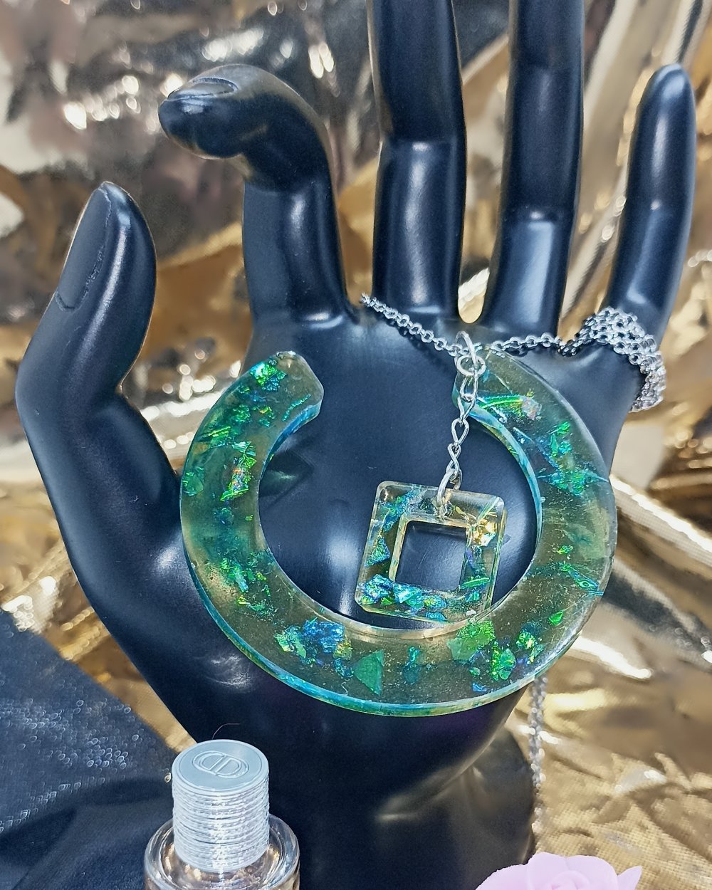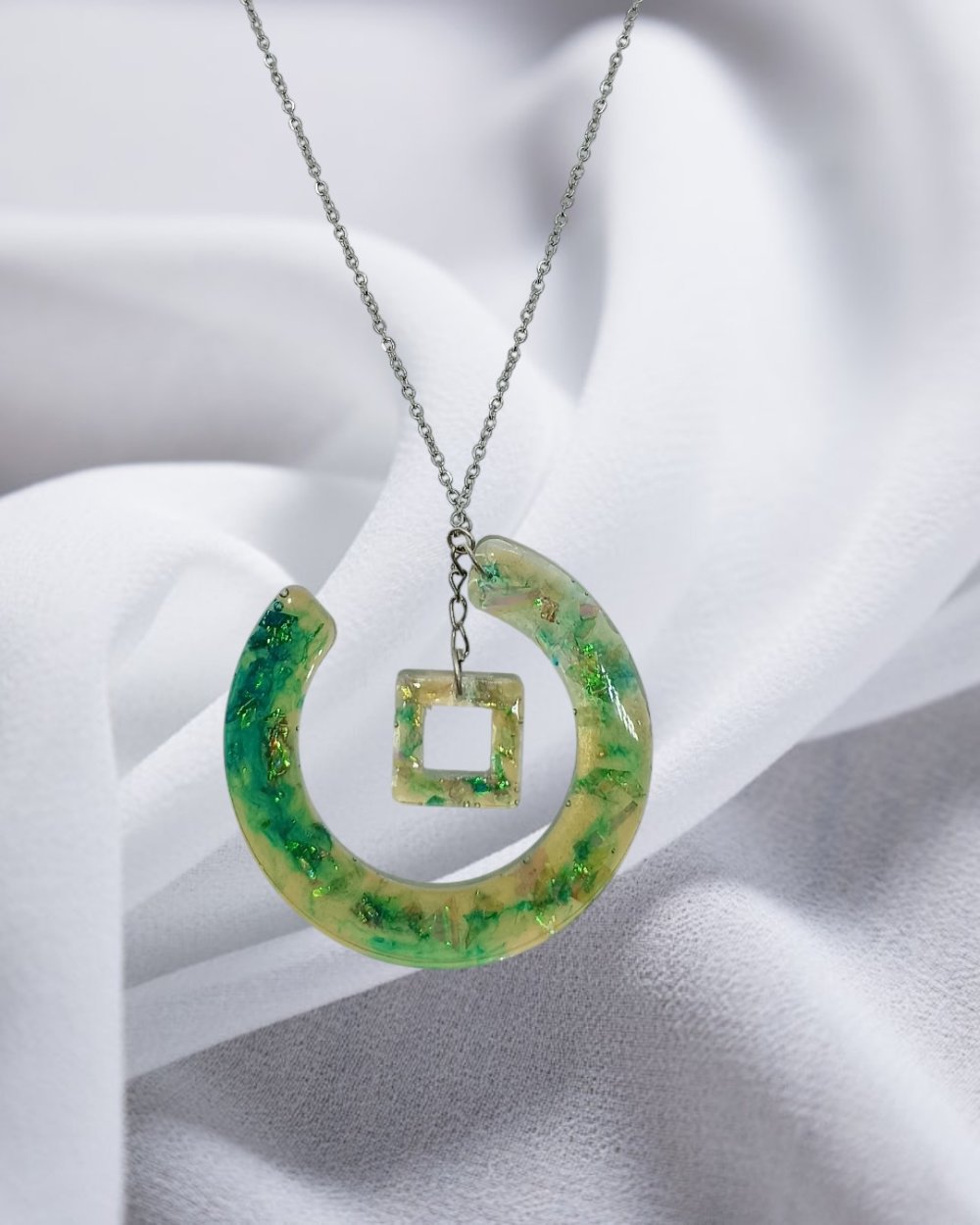 Le pendentif principal est une forme de cercle ouvert coulé à la main en résine époxy cristalline. Ce cercle est rehaussé d'un second pendentif rectangulaire qui y est suspendu, ajoutant du mouvement et une dimension artistique à l'ensemble.