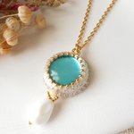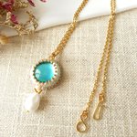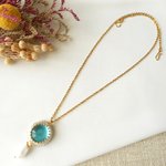 Ce collier sophistiqué présente un pendentif en verre tchèque bleu profond, entouré de perles fines, avec une goutte en verre blanche. Chaîne en inox doré 24K, fermoir artisanal en laiton, pour une allure chic et raffinée.