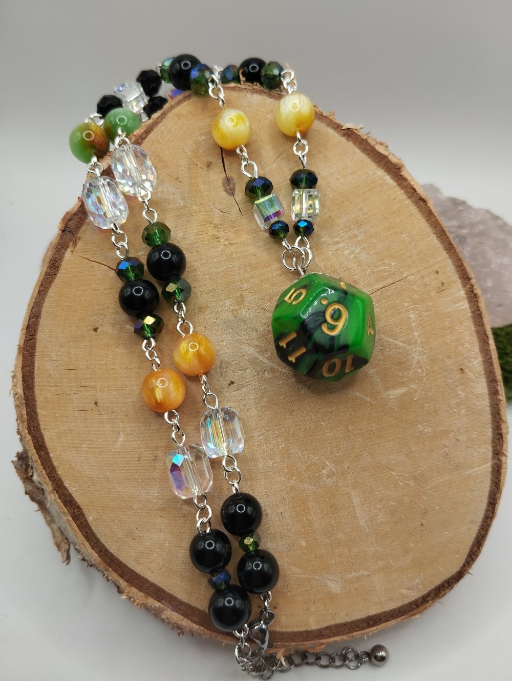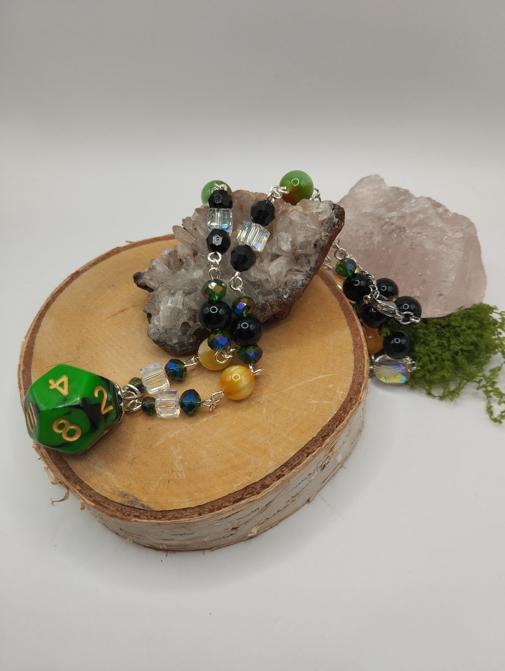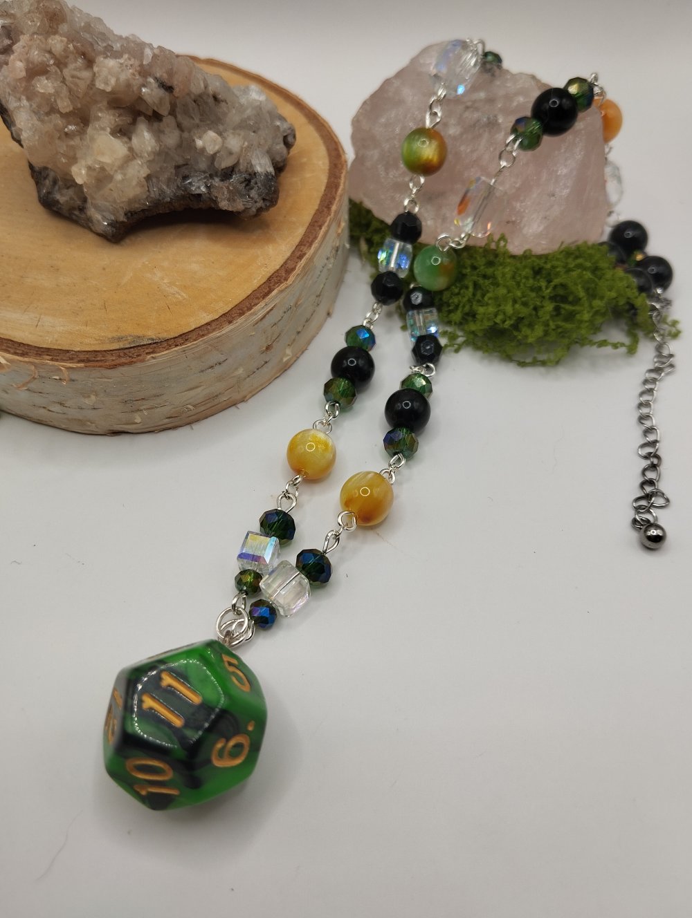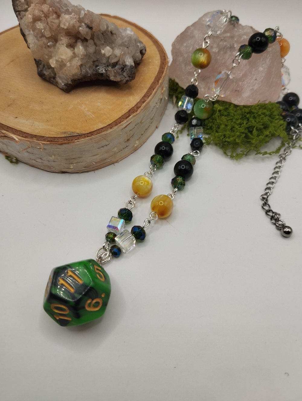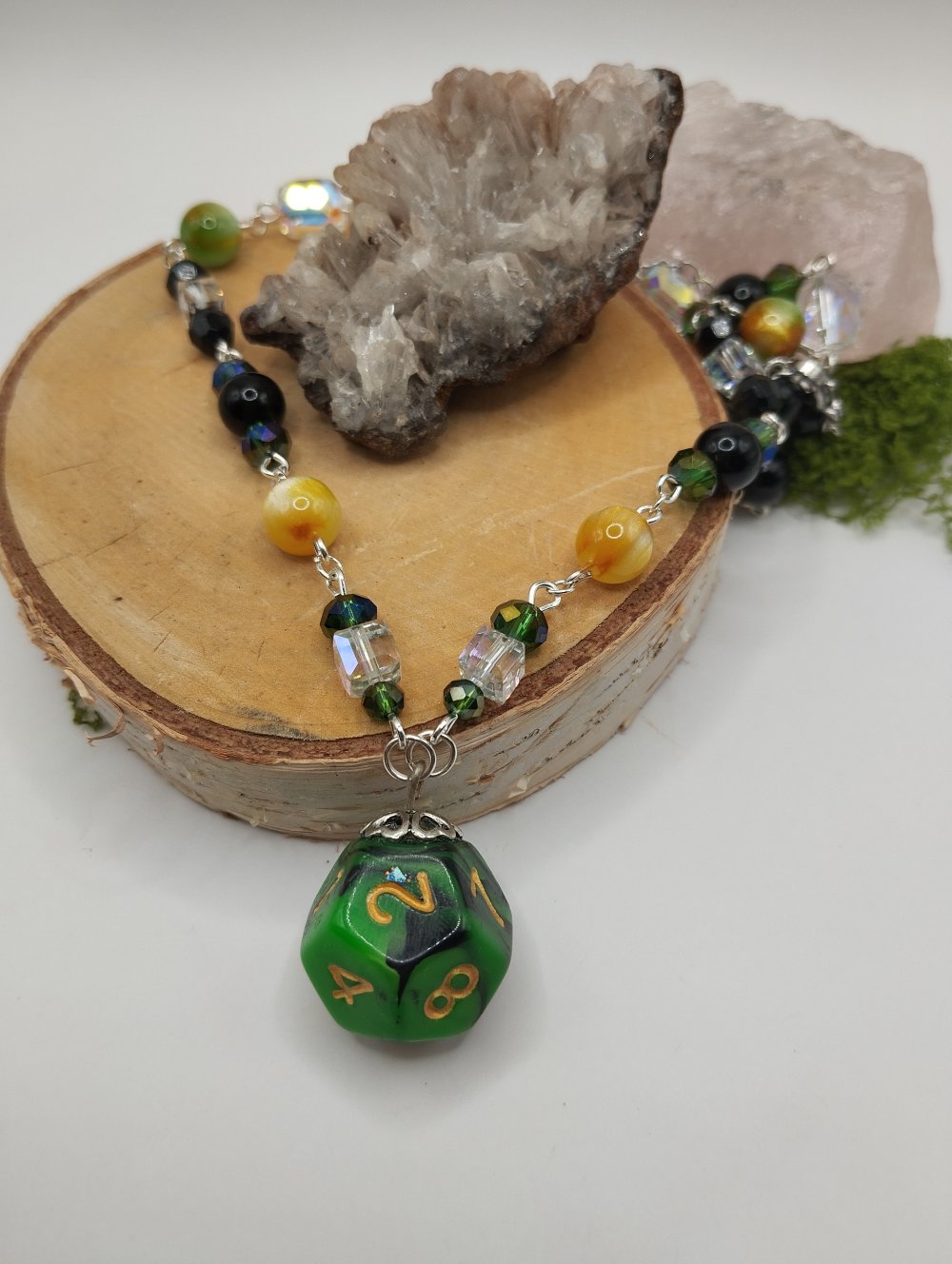 Un collier vibrant inspiré des forêts profondes et de l’univers des jeux de rôle. Le dé D20 vert marbré est mis en valeur par des perles scintillantes aux reflets mystérieux.