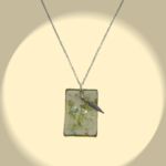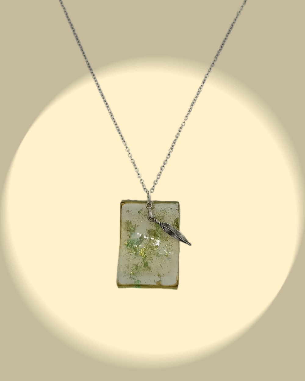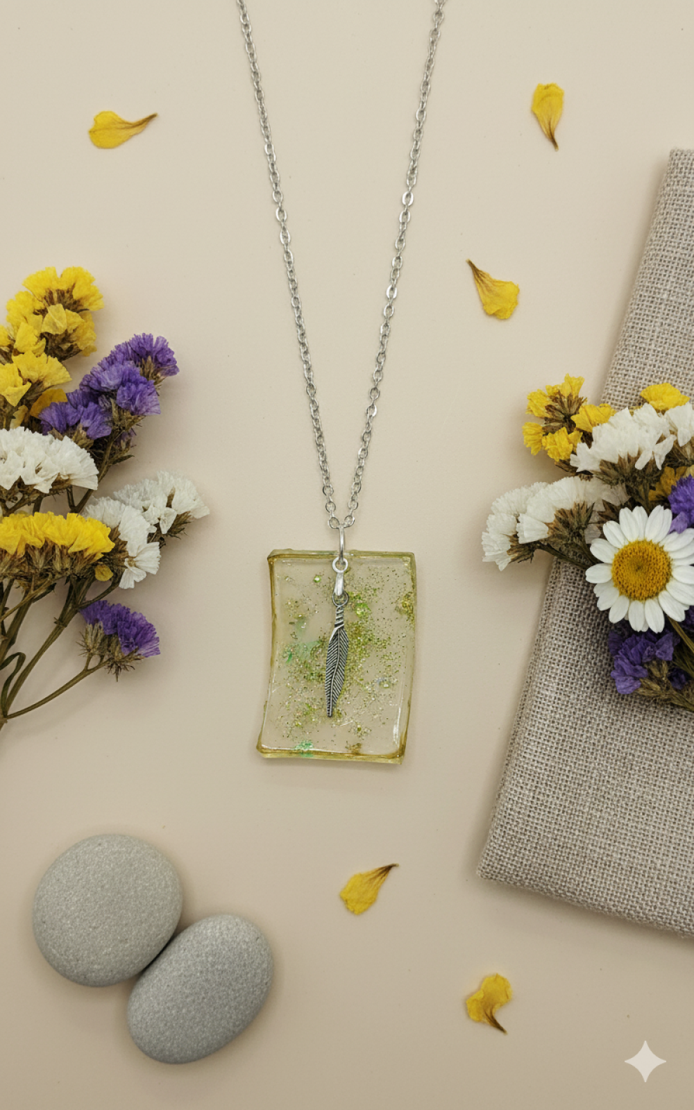 Ce pendentif présente une forme rectangulaire aux bords légèrement arrondis, réalisé avec une résine époxy flexible de haute clarté. La base de la résine est subtilement infusée de paillettes et de mica vertes qui scintillent délicatement à la lumière, lui donnant un aspect frais et printanier.