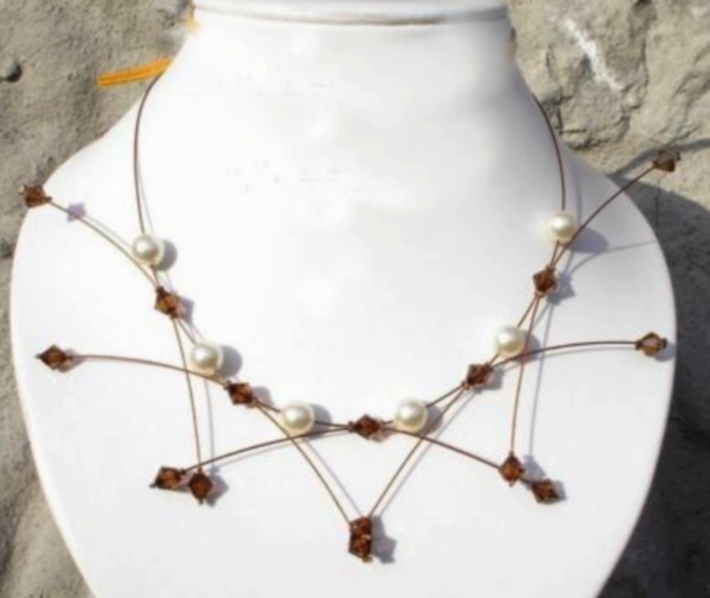 Fabriqué à la main, les bijoux sont surtout fait avec du fil câblé ou nylon, les perles sont en cristal de swarovski, verre de bohème.