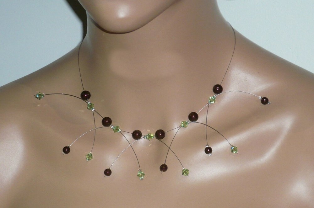 Collier étincelle marron et menthe. Bijoux mariage, collier mariée, collier cérémonie. en ronde nacré 6, 8 mm et toupie 6 mm en cristal de swarovski, sur fil câblé argenté.