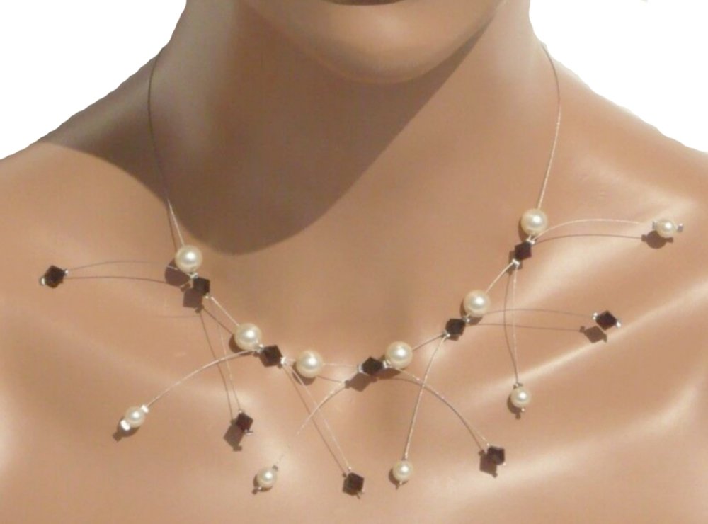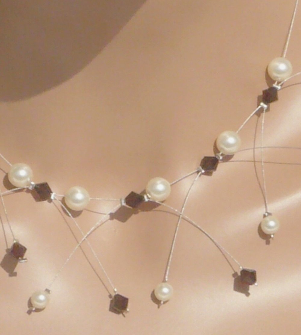 Fabriqué à la main, les bijoux sont surtout fait avec du fil câblé ou nylon, les perles sont en cristal de swarovski, verre de bohème.