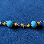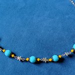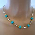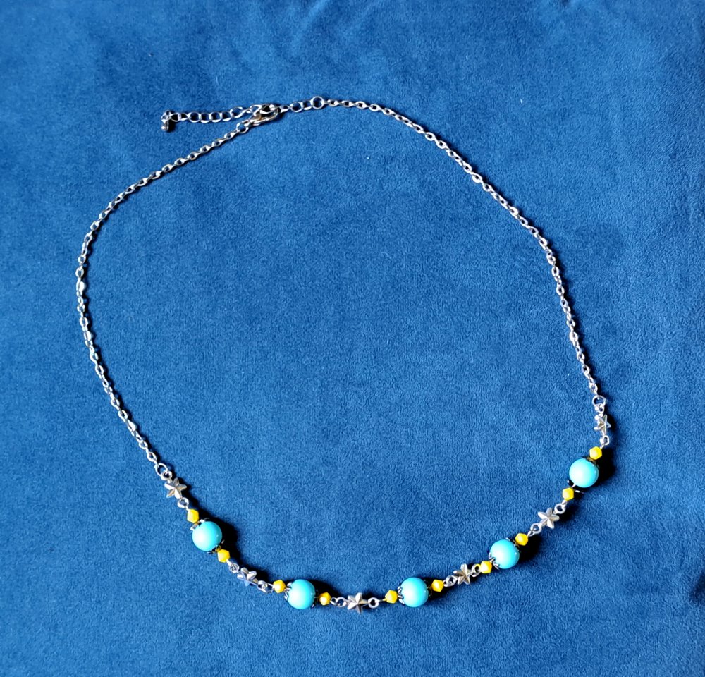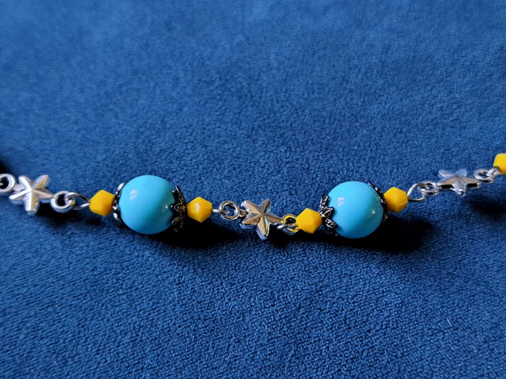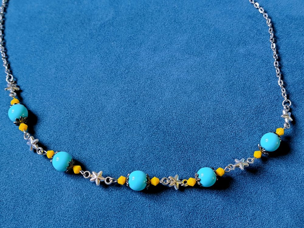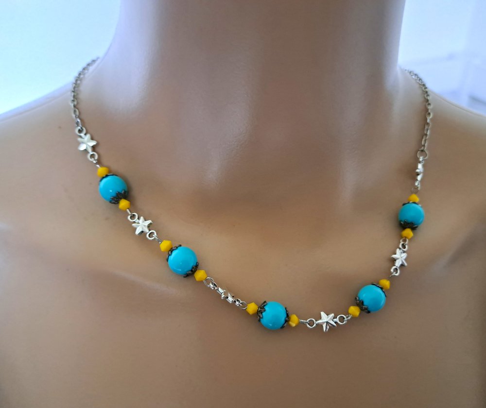 collier étoile, perles en verre jaune, acrylique bleu, fermoir, chaîne en acier inoxydable argenté
