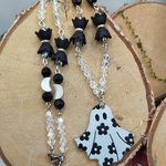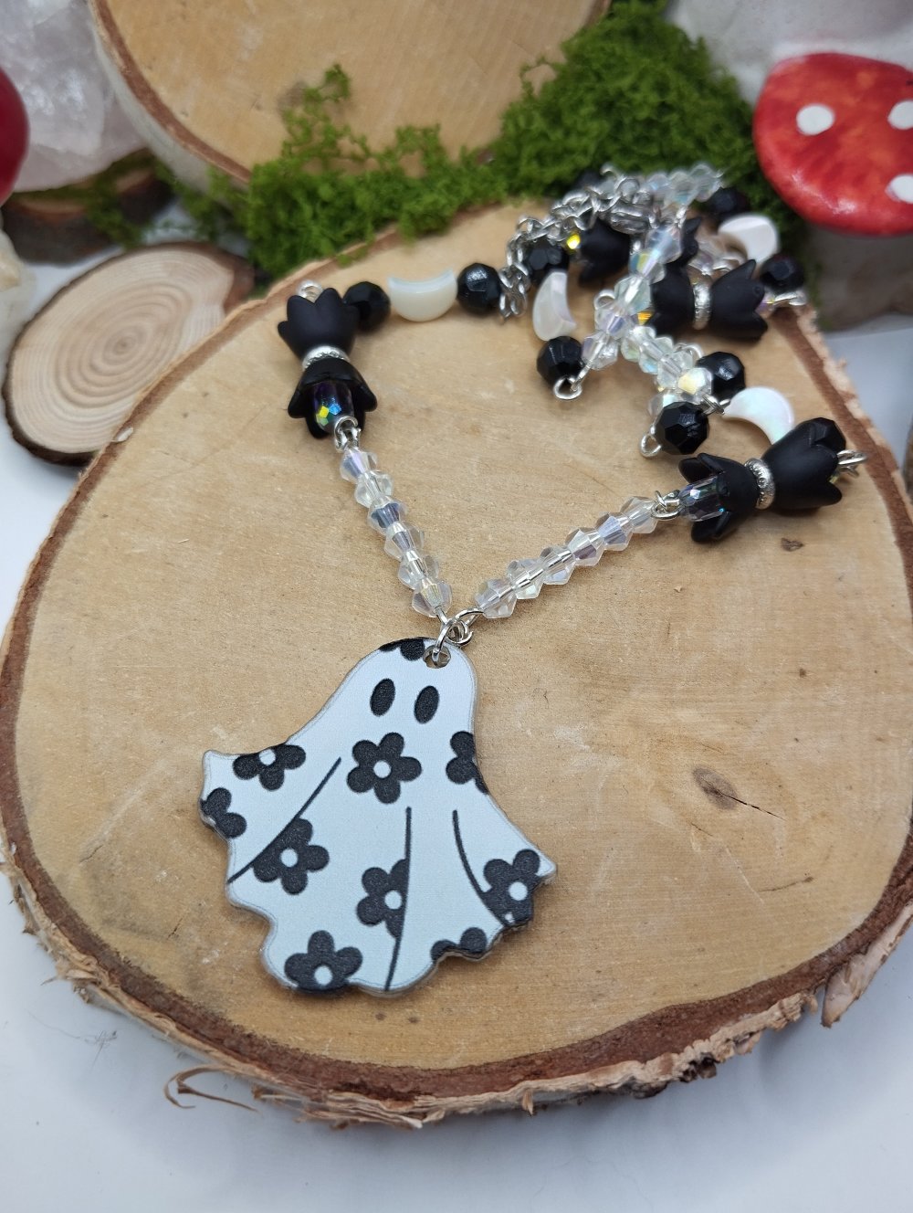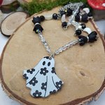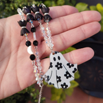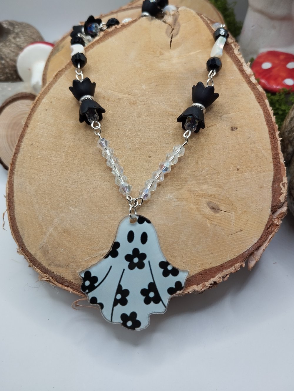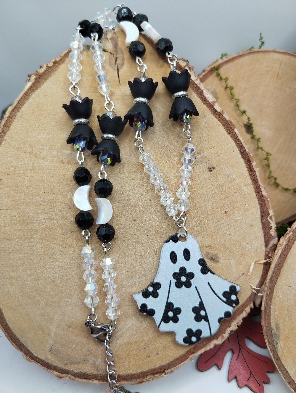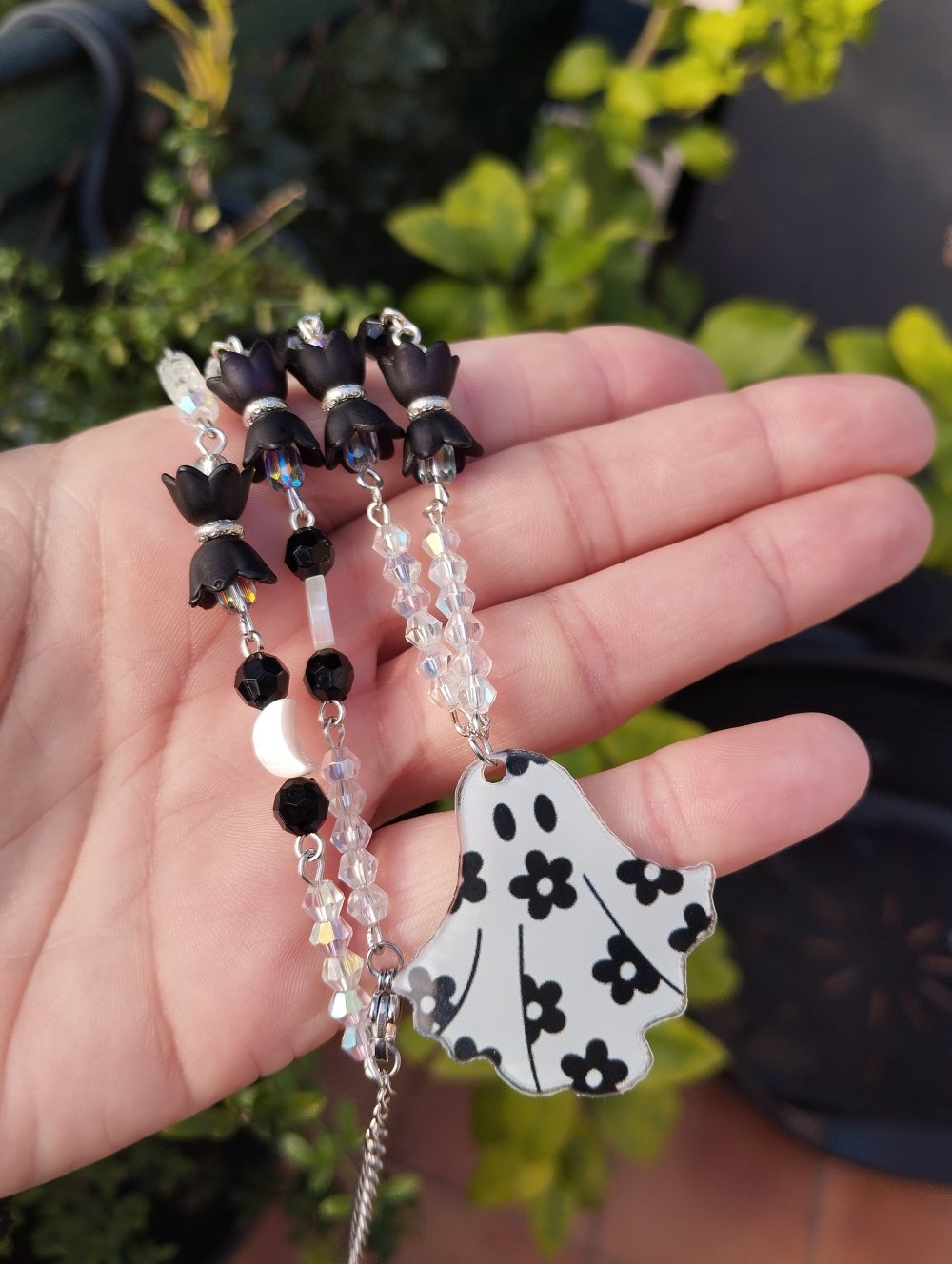 Son pendentif en forme de petit fantôme blanc paré de fleurs noires apporte une touche "spooky cute" irrésistible. Monté sur une chaîne ornée de perles noires, irisées et de fleurs en calottes, ce bijou joue sur les contrastes entre l’élégance sombre et la fantaisie.