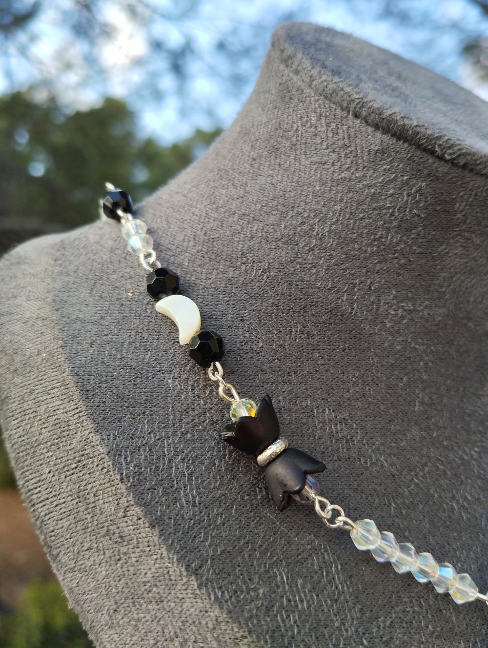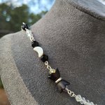 Chaîne composée de perles en verre, perles nacrées et fleurs noires