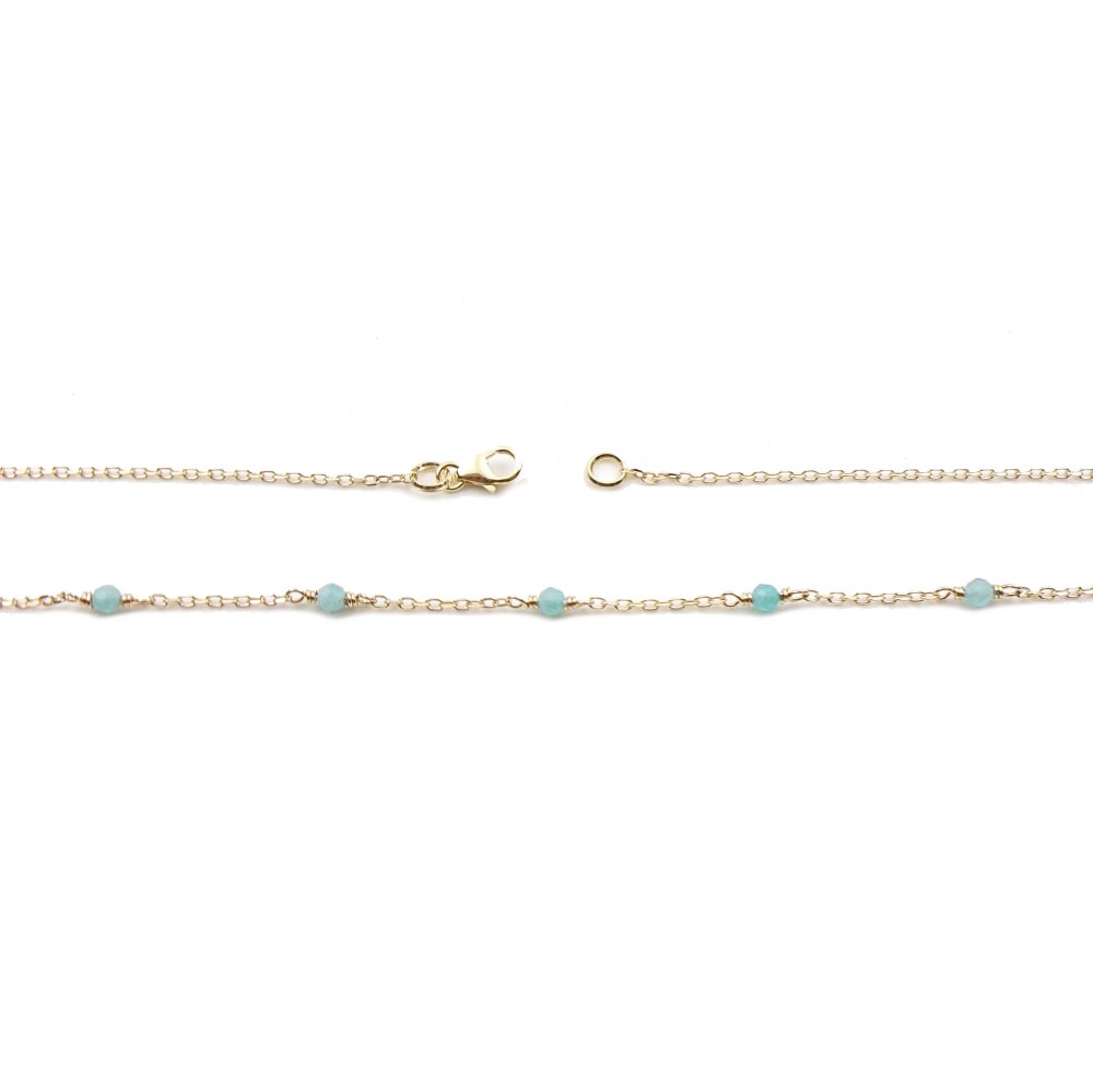 Ce collier fait main en or 18 carats met en valeur la beauté des pierres naturelles d’amazonite, connues pour leurs reflets uniques et leurs propriétés apaisantes.