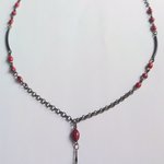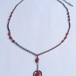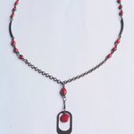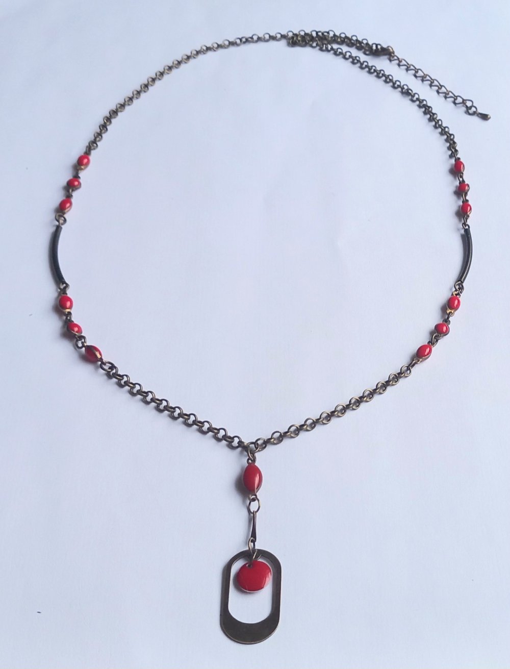 Montage sur une chaîne fantaisie, d'un pendentif et de petits connecteurs tube en laiton couleur bronze et de sequins émaillés ronds et ovals en émail rouge.
