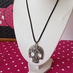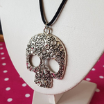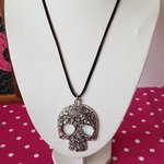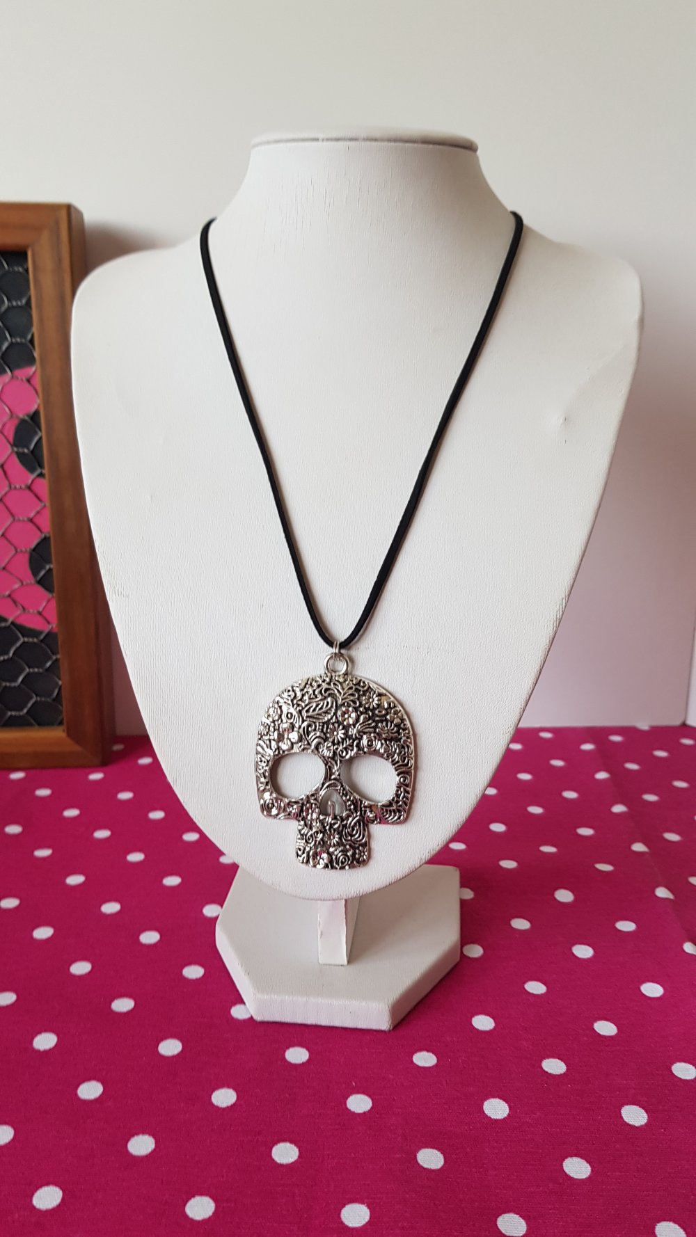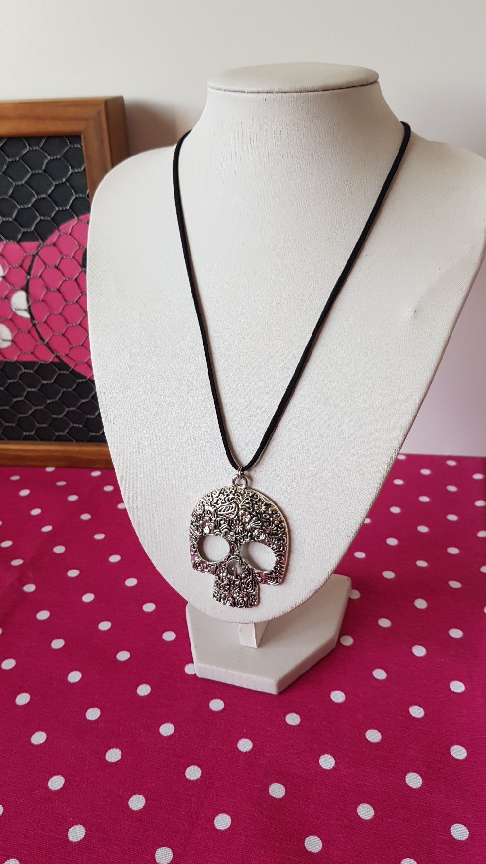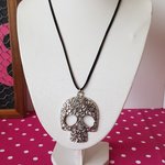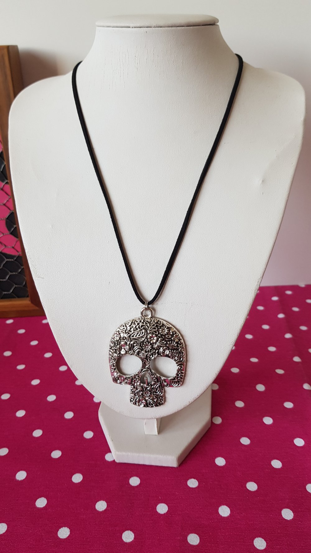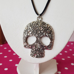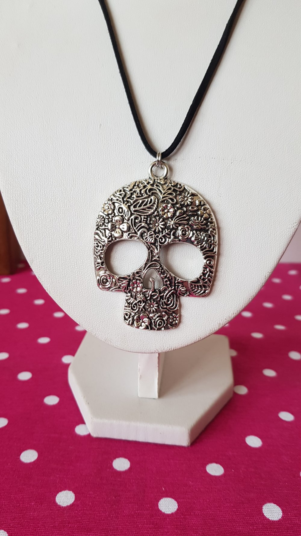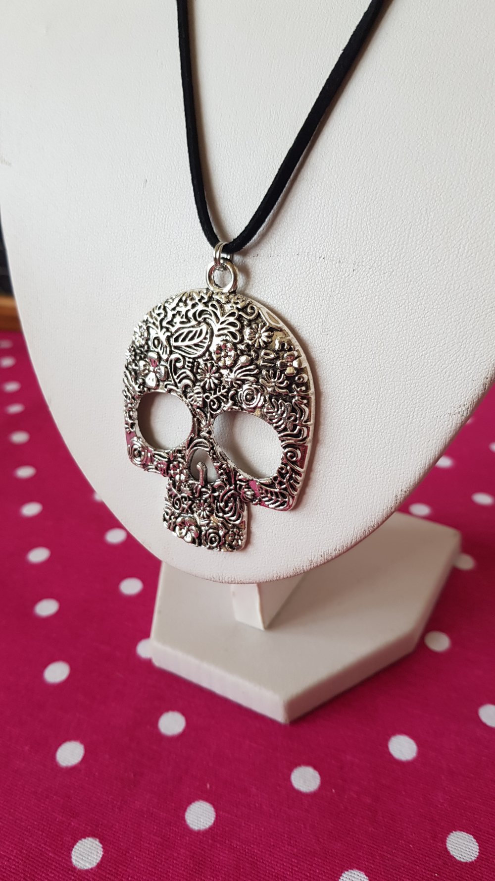 Imposant et rock, deux adjectifs qui correspond exactement à ce collier sur cordon de suédine noir, un peu de douceur, pendentif en métal gravé et ajouré en forme de grande tête de mort , original et affirmé !