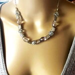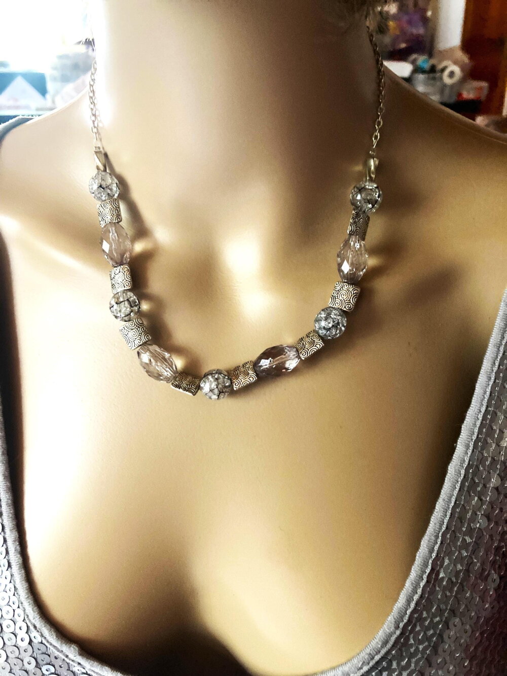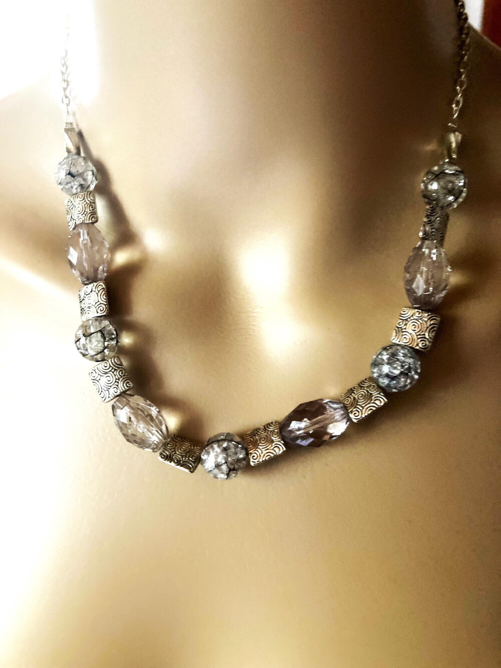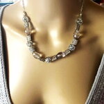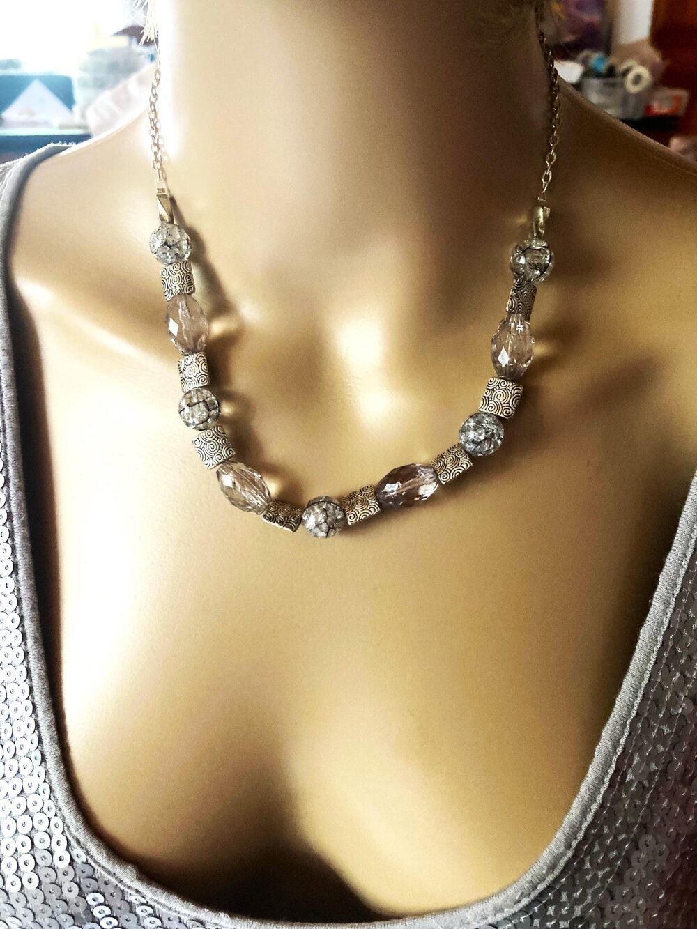 Collier jolies perles carrées métal martelées argentées et jolies perles fantaisie en acrylique finition chaîne argentée bijoux femme.