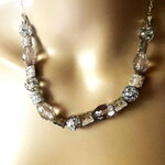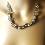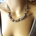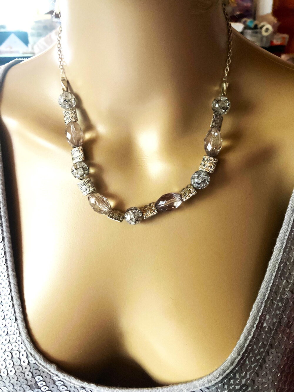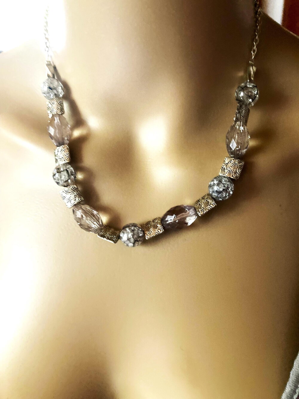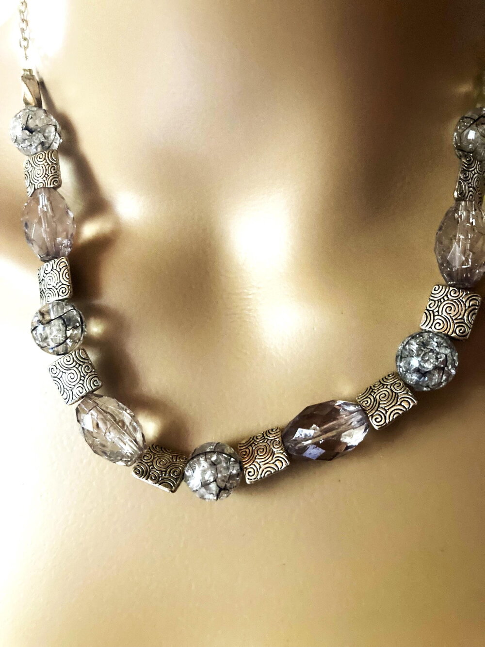 Collier jolies perles carrées métal martelées argentées et jolies perles fantaisie en acrylique finition chaîne argentée bijoux femme.