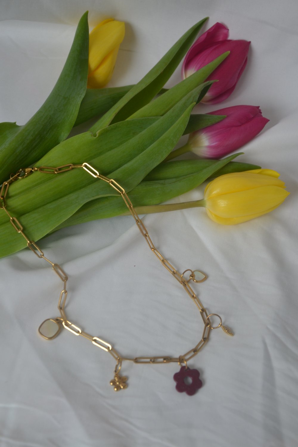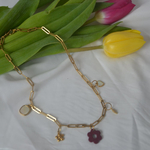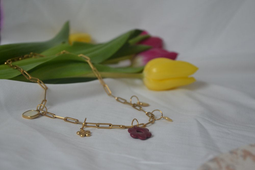 Sa chaîne en acier inoxydable 316, au design trombone tendance et intemporel, est sublimée par plusieurs breloques délicates et une fleur bordeaux réalisée à la main au centre.