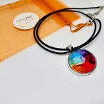 Je vous propose une de mes créations. Joli collier composé d'un lacet cuir noir de 45cm et d'un pendentif en acier inoxydable de 25mm avec cabochon en verre. Motif abstrait coloré. PIÈCE UNIQUE