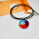 Collier lacet cuir et pendentif cabochon verre motif abstrait coloré