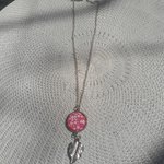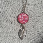 Sautoir argenté avec un pendentif liberty fleur rose et blanche puis son cabochon de verre rond. Agrémenté d'une breloque feuille.