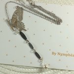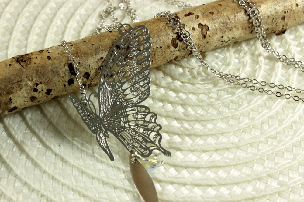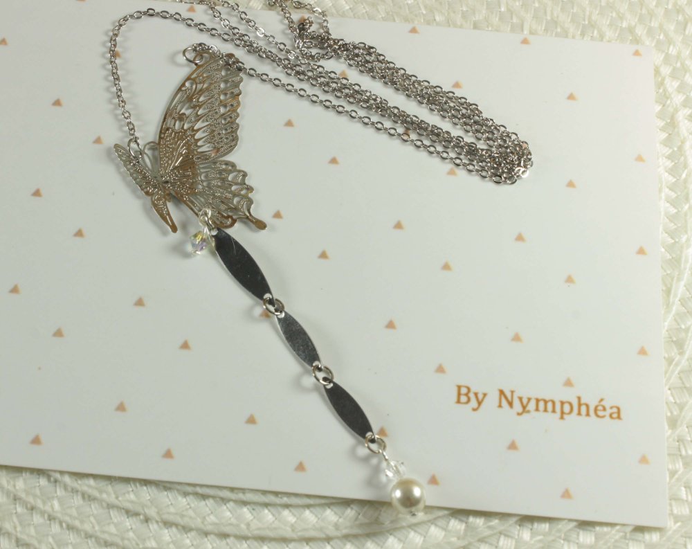 Collier en plaqué rhodium dentelle de papillon argenté et perles nacrées Swarovski, collier pour femme, ByNymphéa