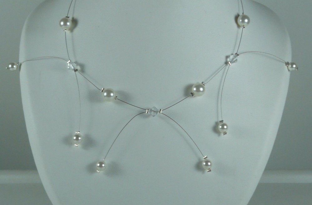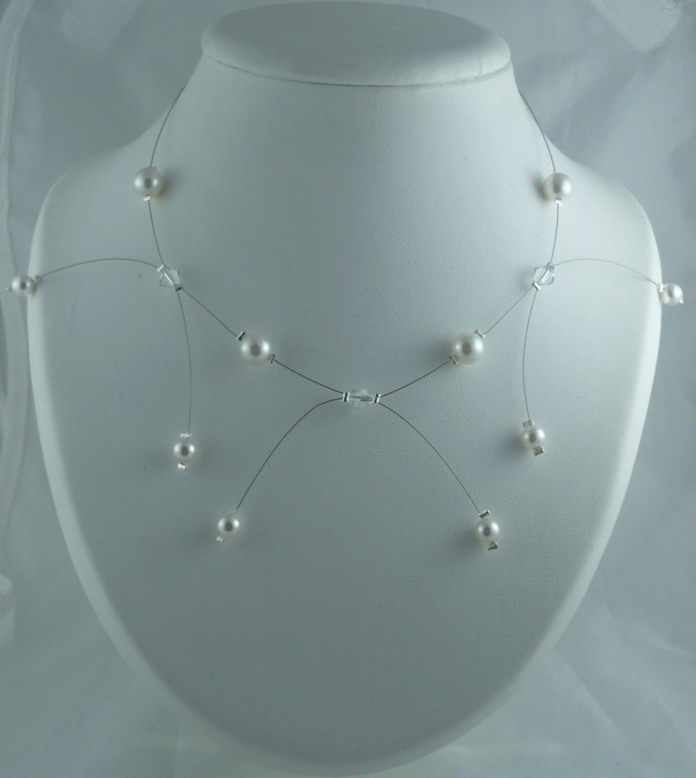 Fabriqué à la main, les bijoux sont surtout fait avec du fil câblé ou nylon, les perles sont en cristal de swarovski, verre de bohème.