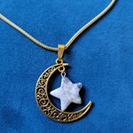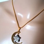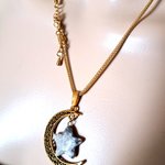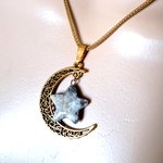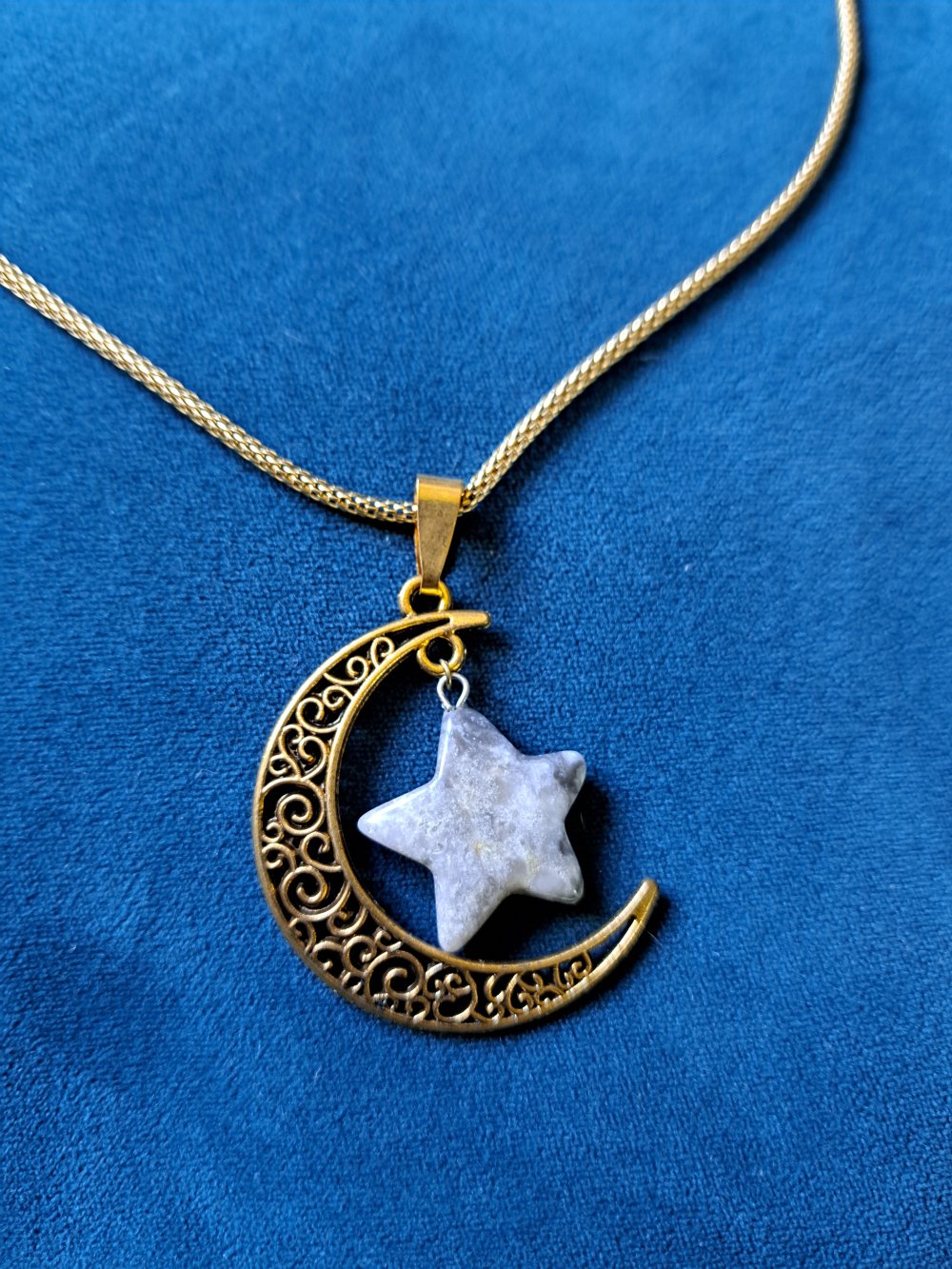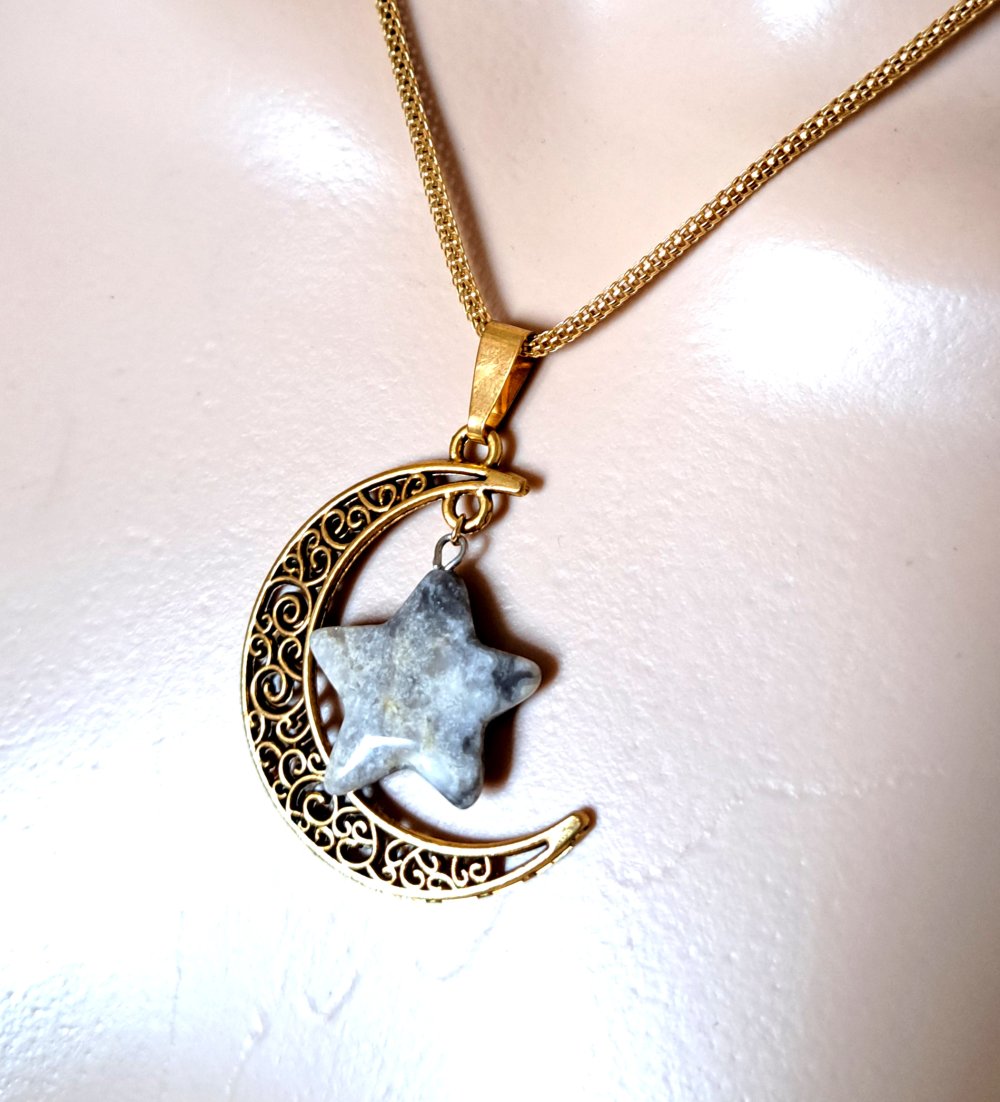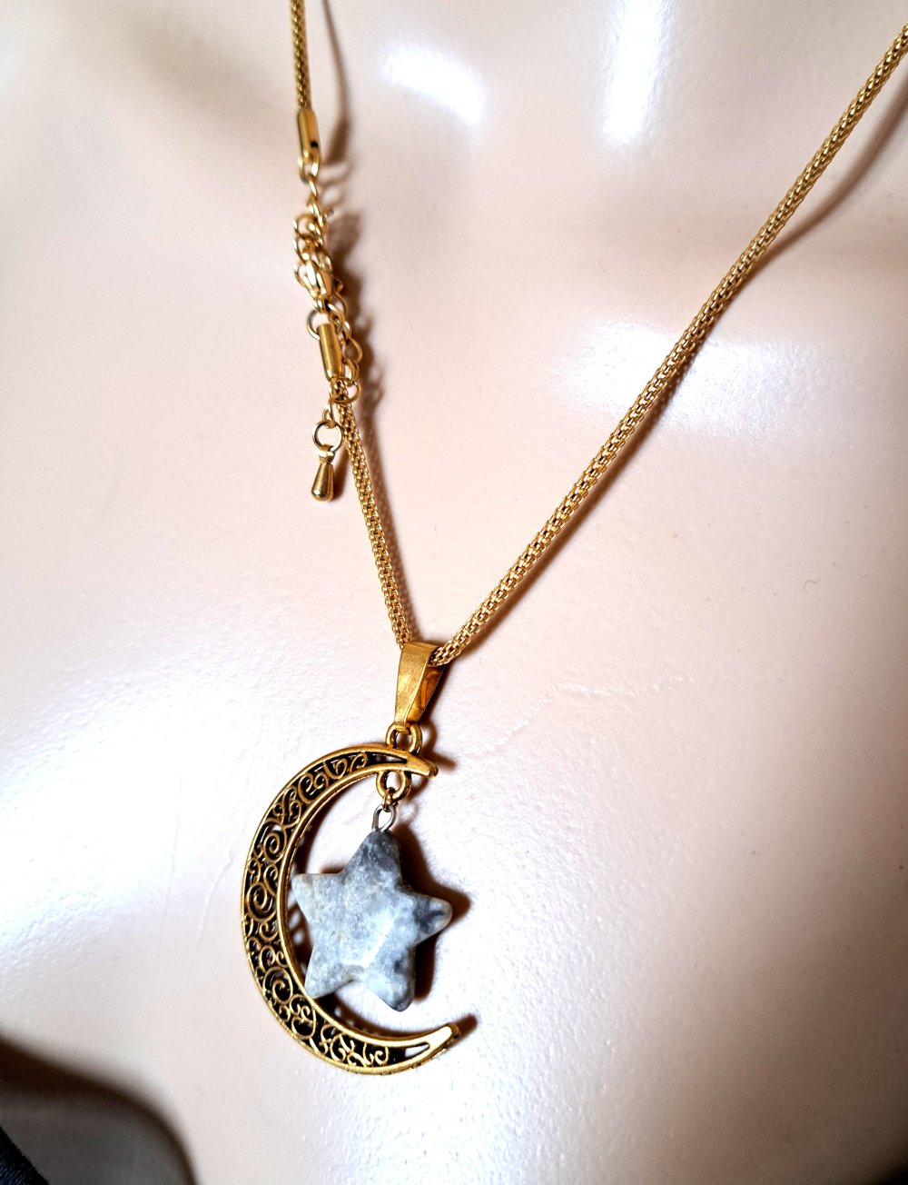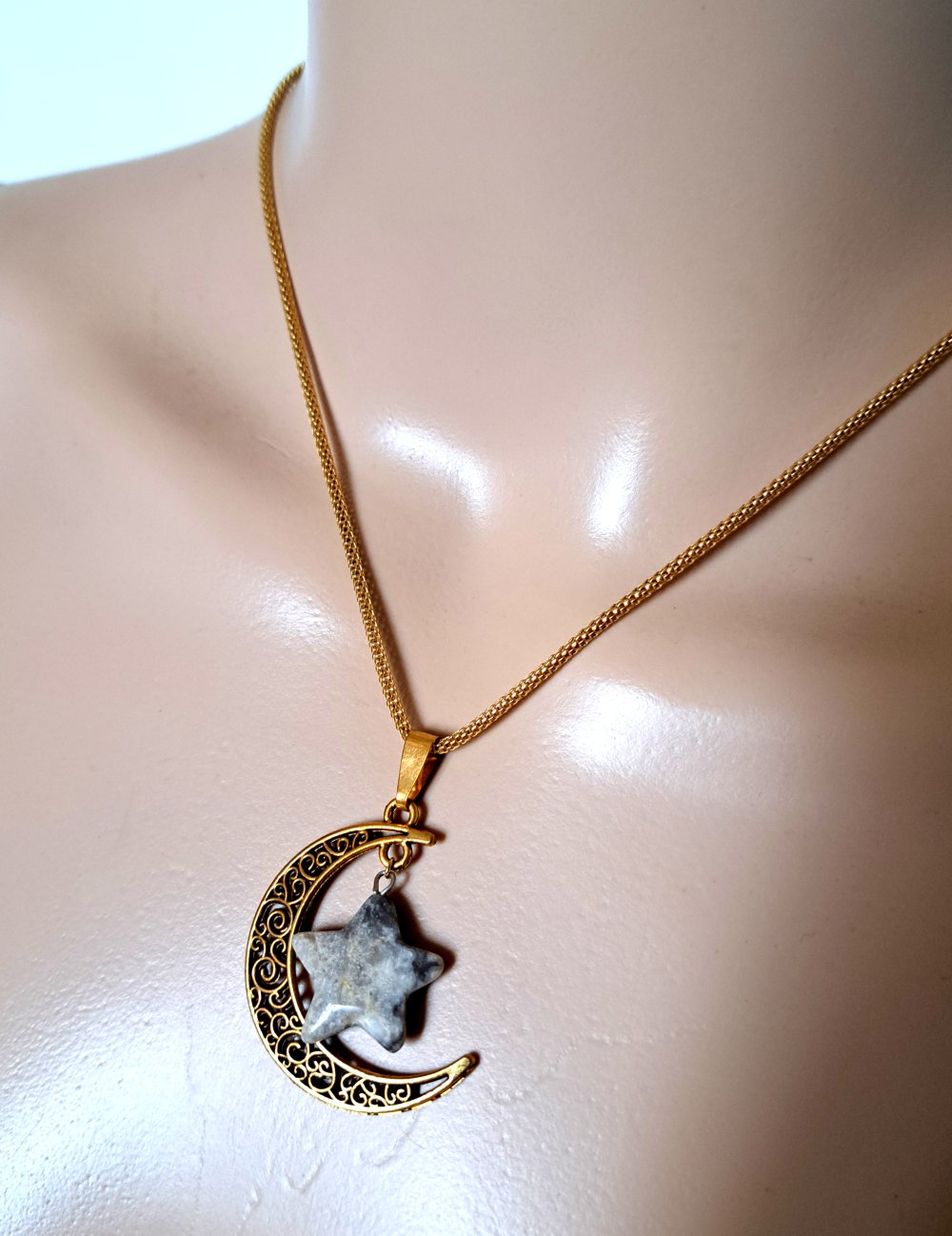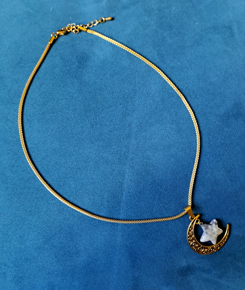 Collier mi long, pendentif demi lune ajouré, étoile en verre beige, gris marbré, chaîne ronde en métal doré acier inoxydable