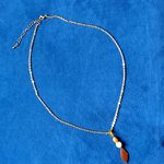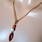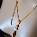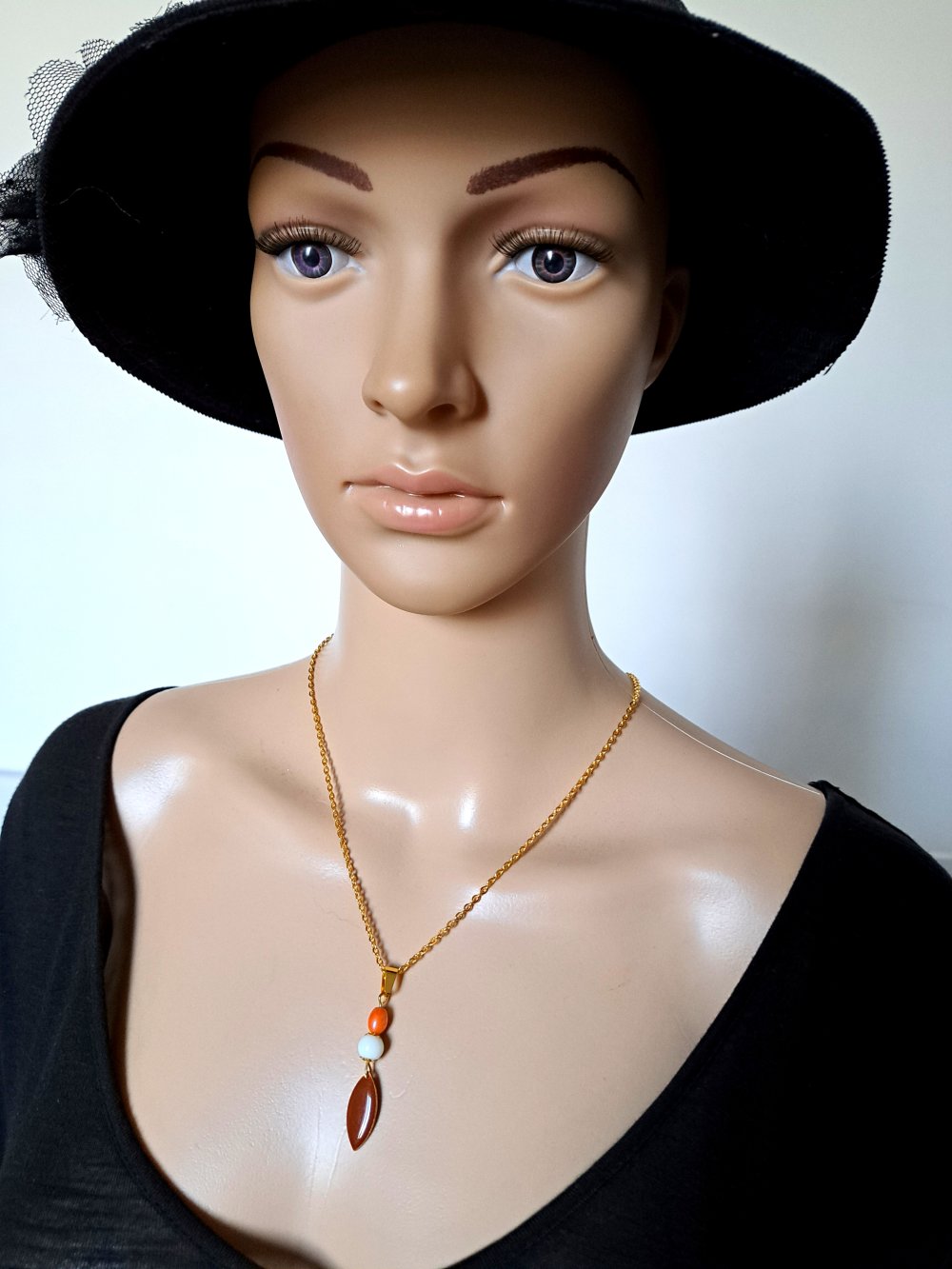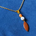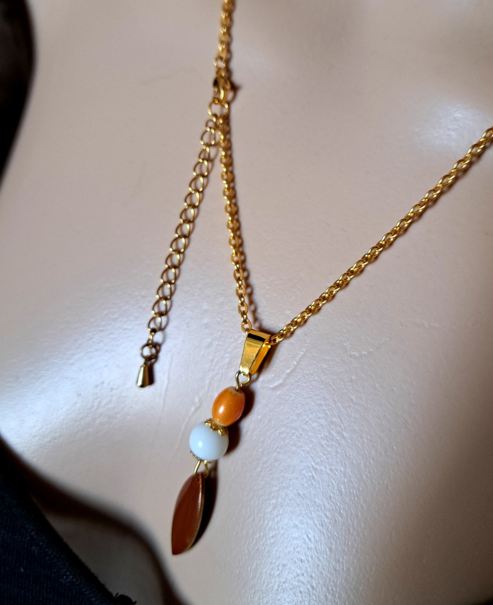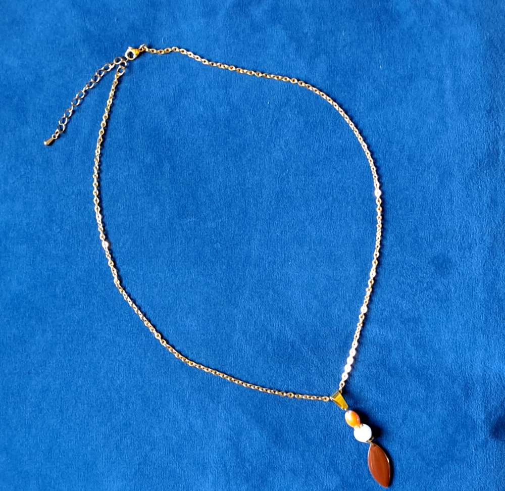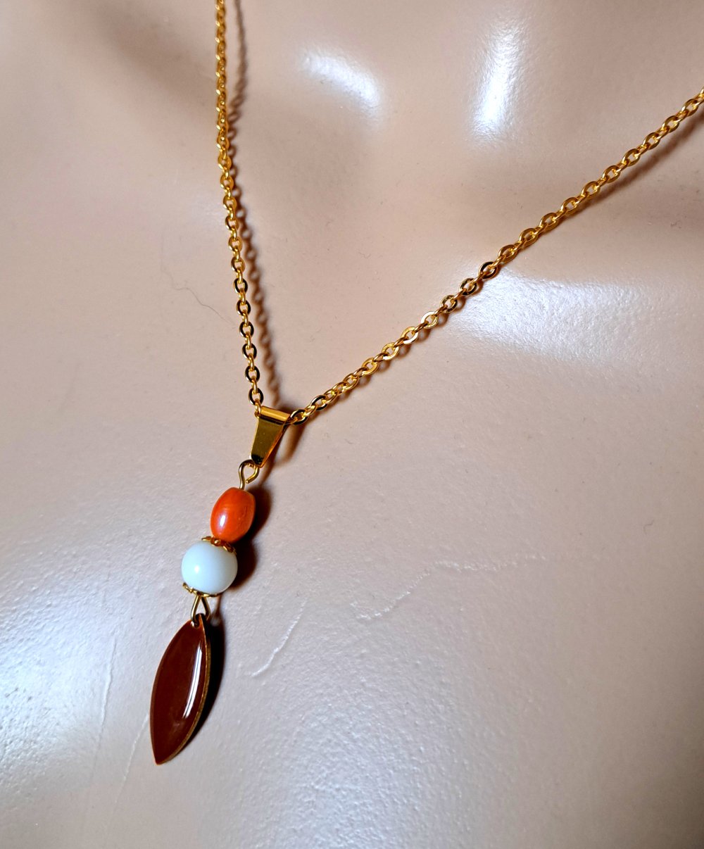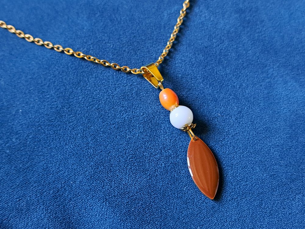 Collier mi long, pendentif ovale émaillé marron, perles en verre orange, blanche, chaîne en métal acier inoxydable doré