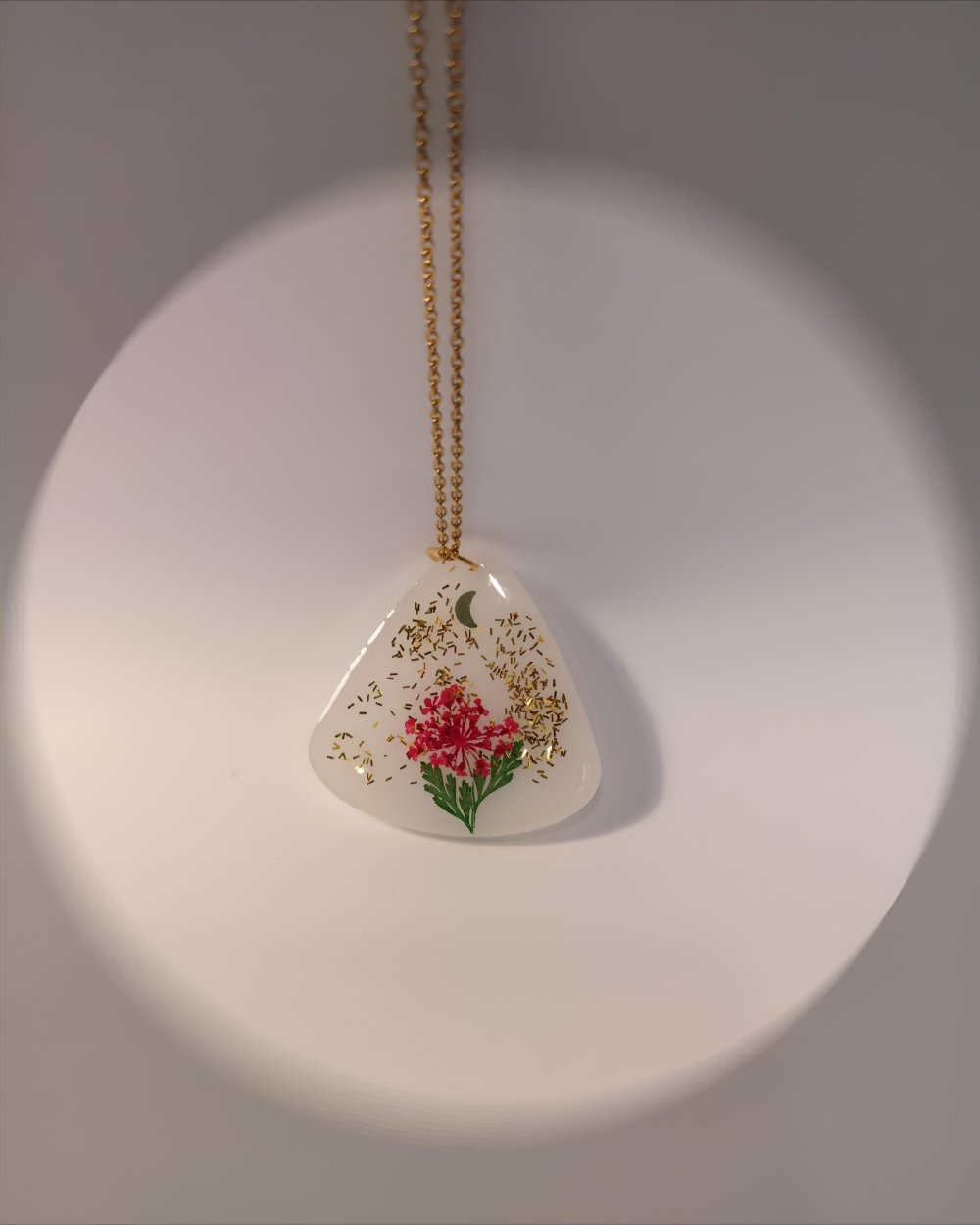 Son pendentif, une pièce unique en résine époxy, arbore une teinte blanc laiteux qui évoque la douceur d'une perle.