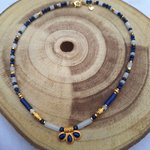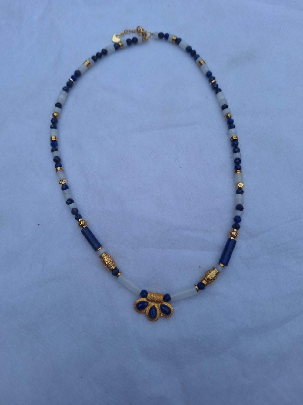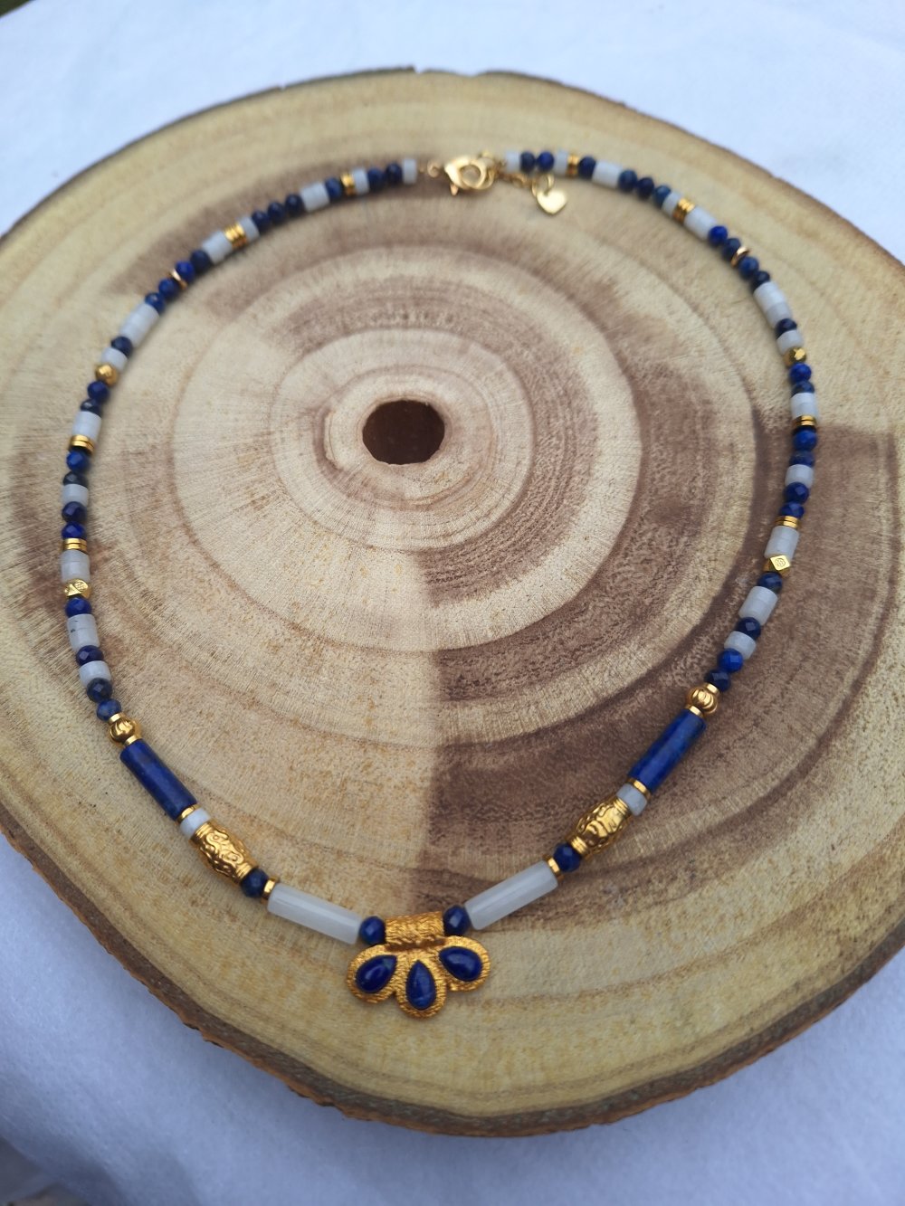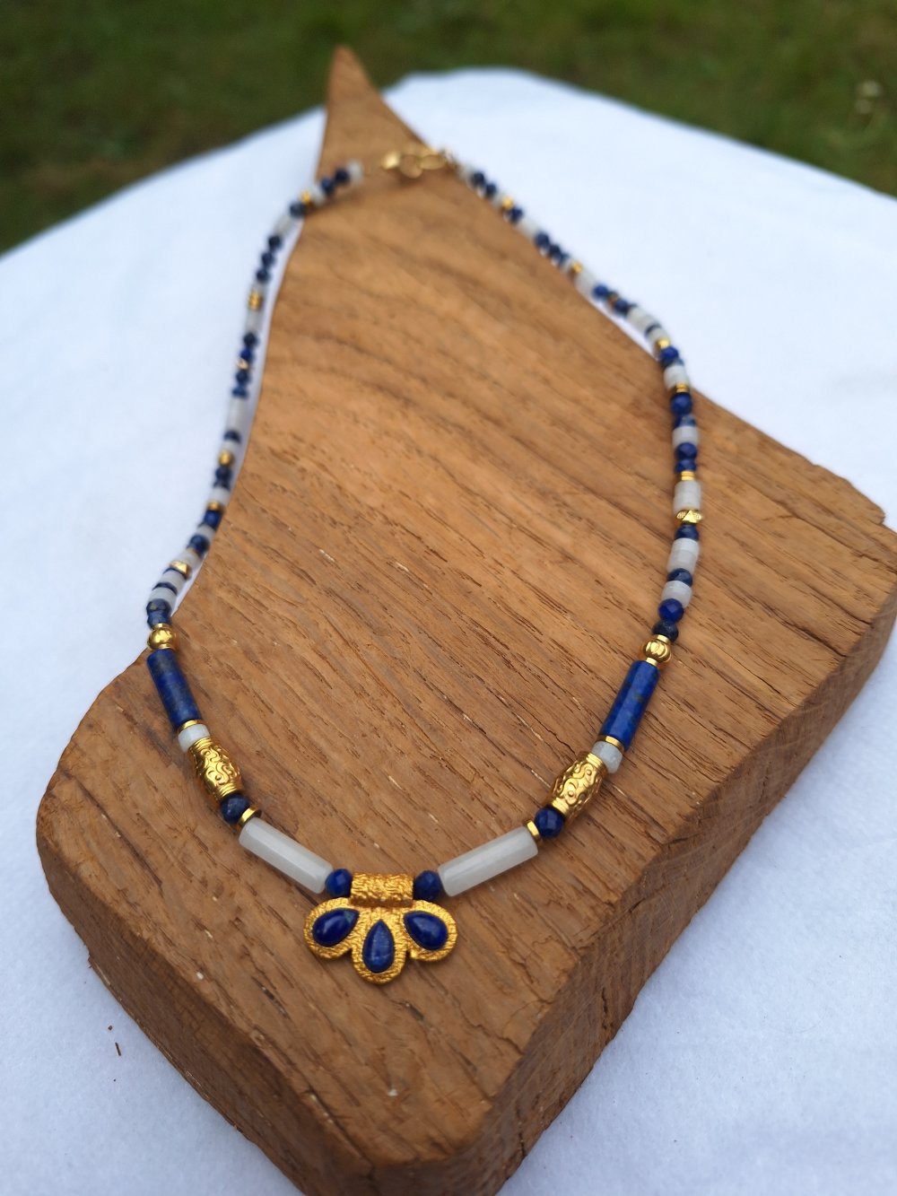 Collier lapis lazuli et agate blanche et perles acier inoxydable doré à l'or fin.