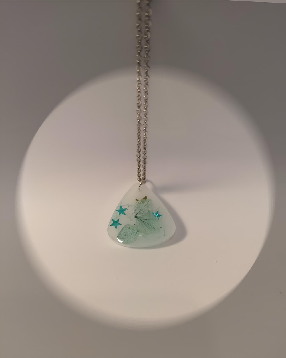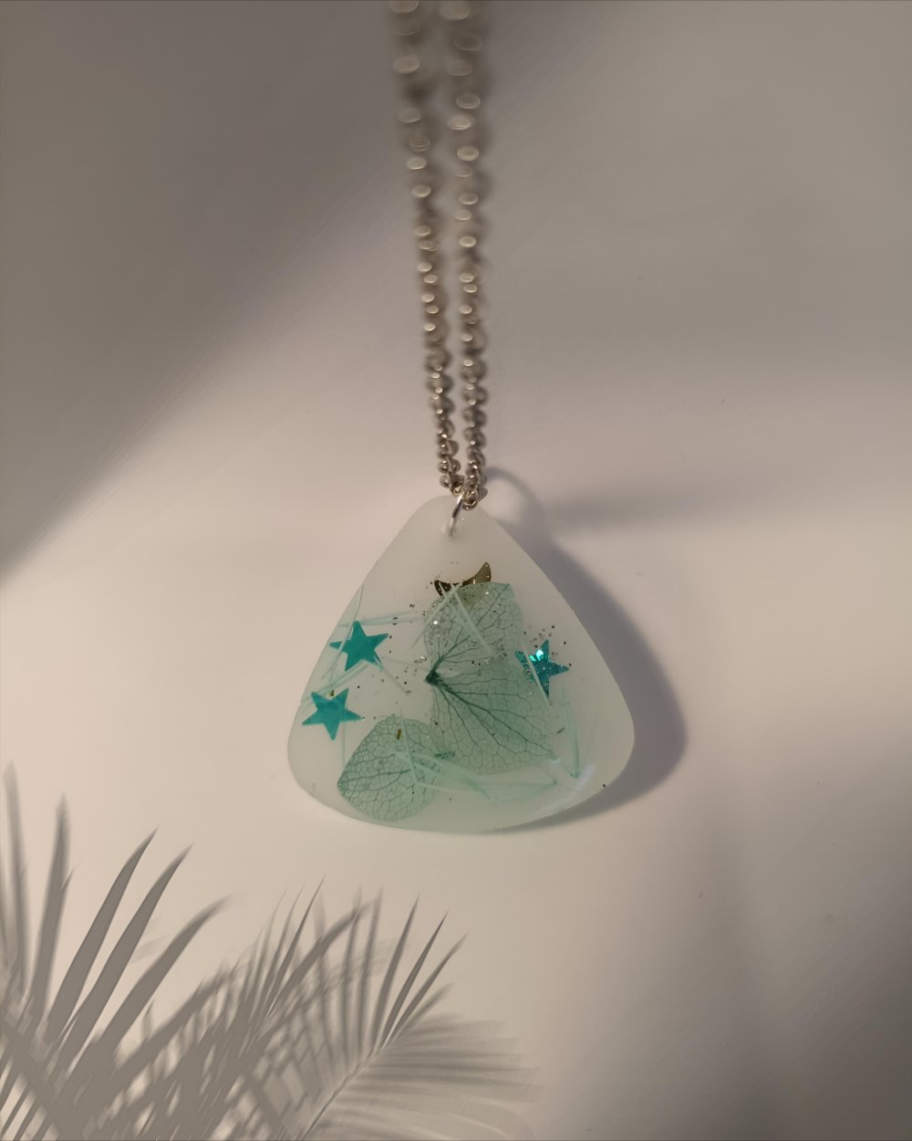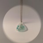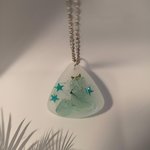 "Laissez-vous transporter par la magie de ce collier unique, véritable petit cosmos miniature capturé dans une goutte de résine opalescente.