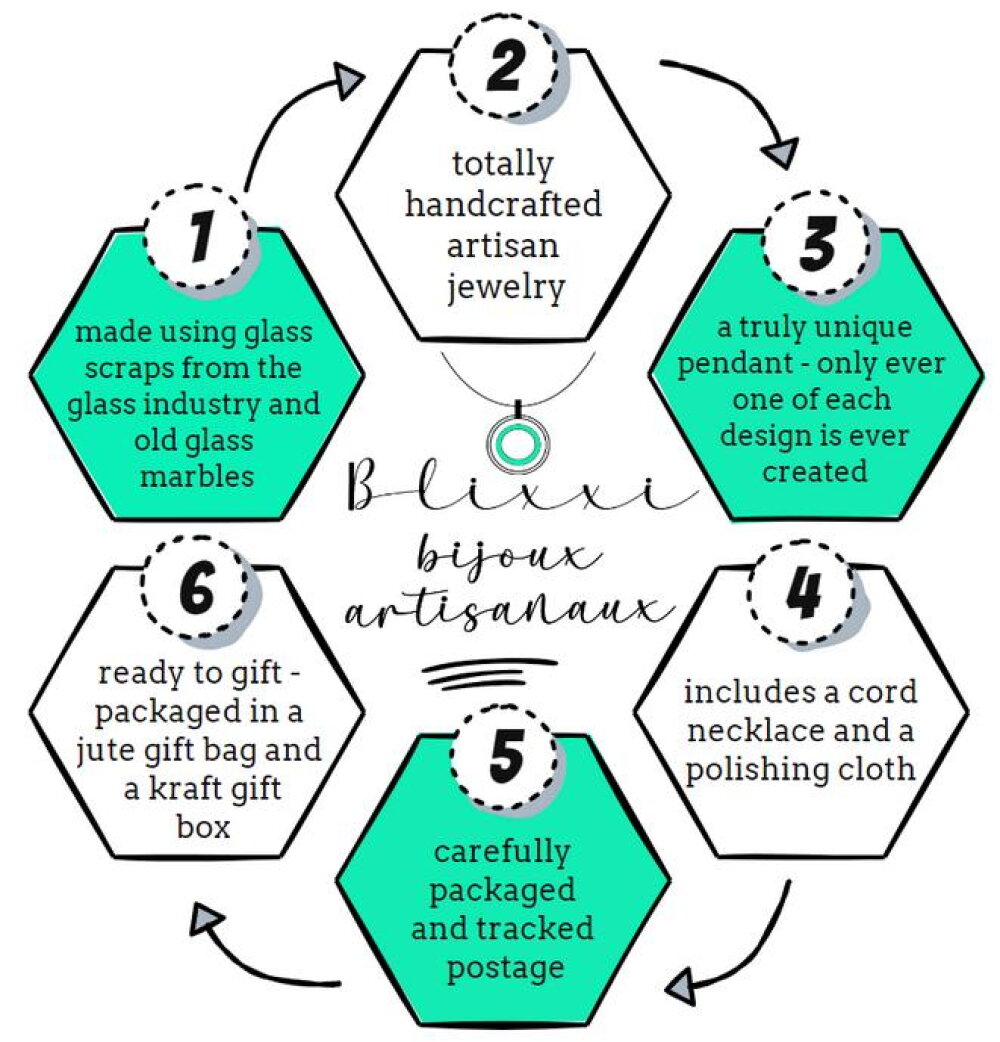 Mes pendentifs sont entièrement fabriqués à la main, ce qui les rend tous uniques. Les attaches des pendentifs sont aussi confectionnées par moi en aluminium. Je sélectionne soigneusement les morceaux de verre dont les couleurs et les motifs s'harmonisent bien, puis je commence le processus de fusion. En travaillant le verre au fur et à mesure qu'il fond et se reforme, je lui donne la forme désirée. Une fois satisfait de la forme, je laisse le verre refroidir. Après refroidissement, je retravaille le pendentif avec une meuleuse pour éliminer les bosses et les bords tranchants. Enfin, la pièce est polie et fixée avec de la résine à une attache, garantissant ainsi une fixation très solide.