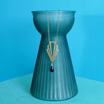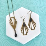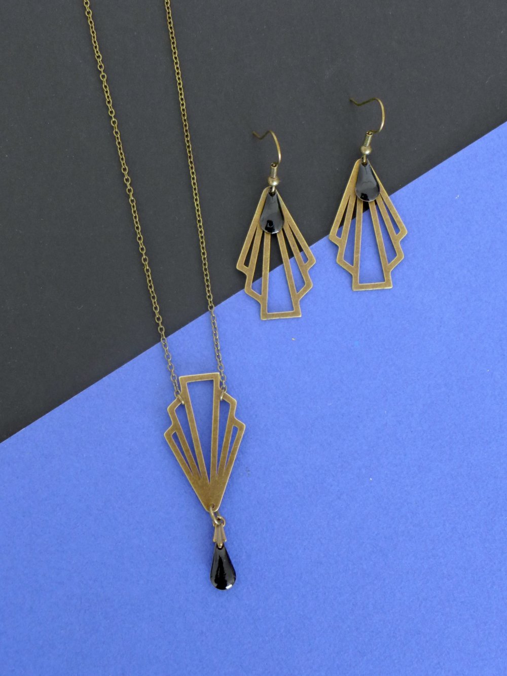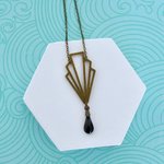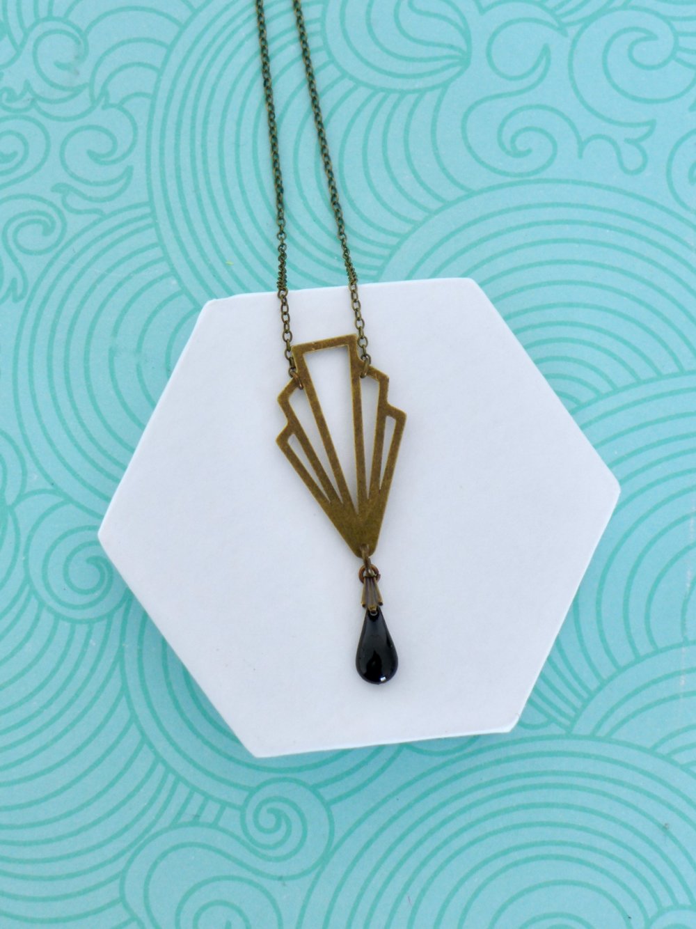 Collier Art Déco avec son pendentif éventail graphique bronze et sequin en émail noir.