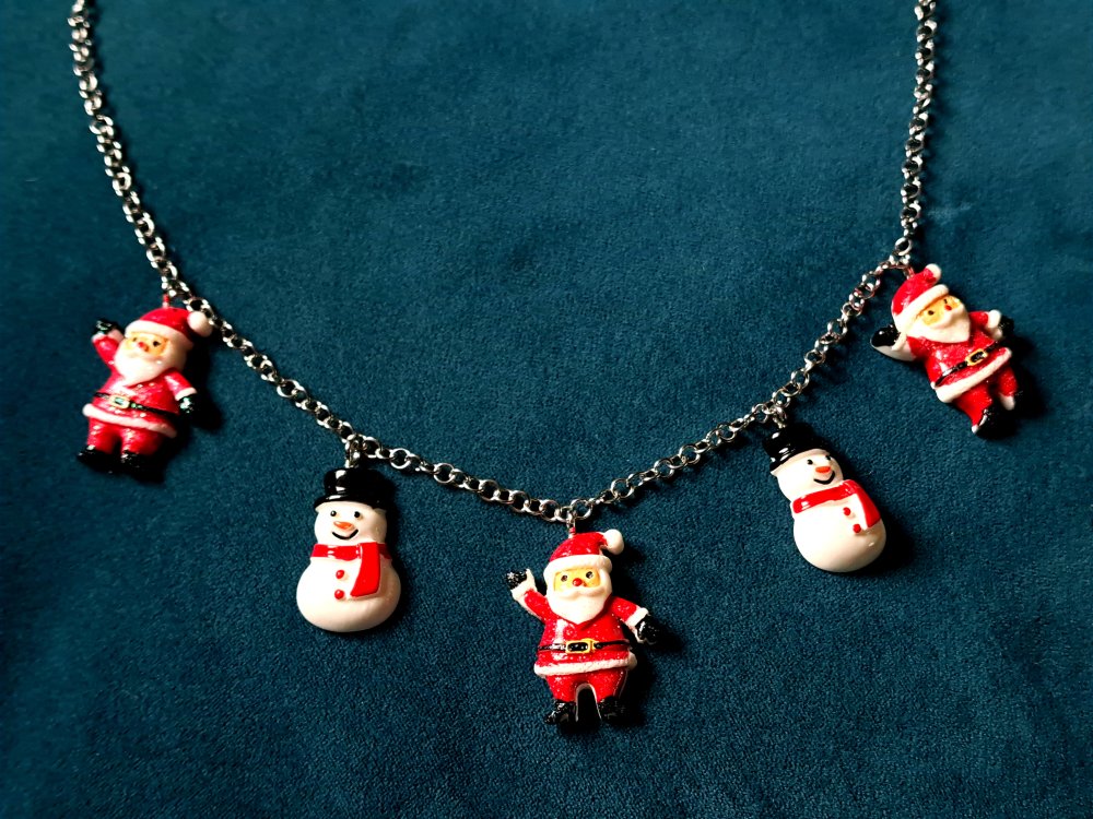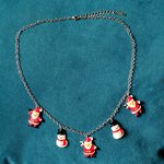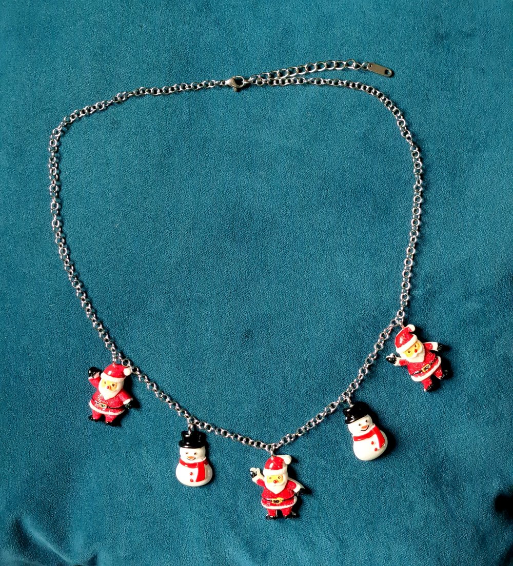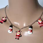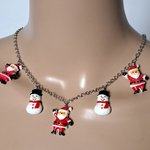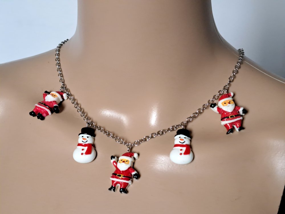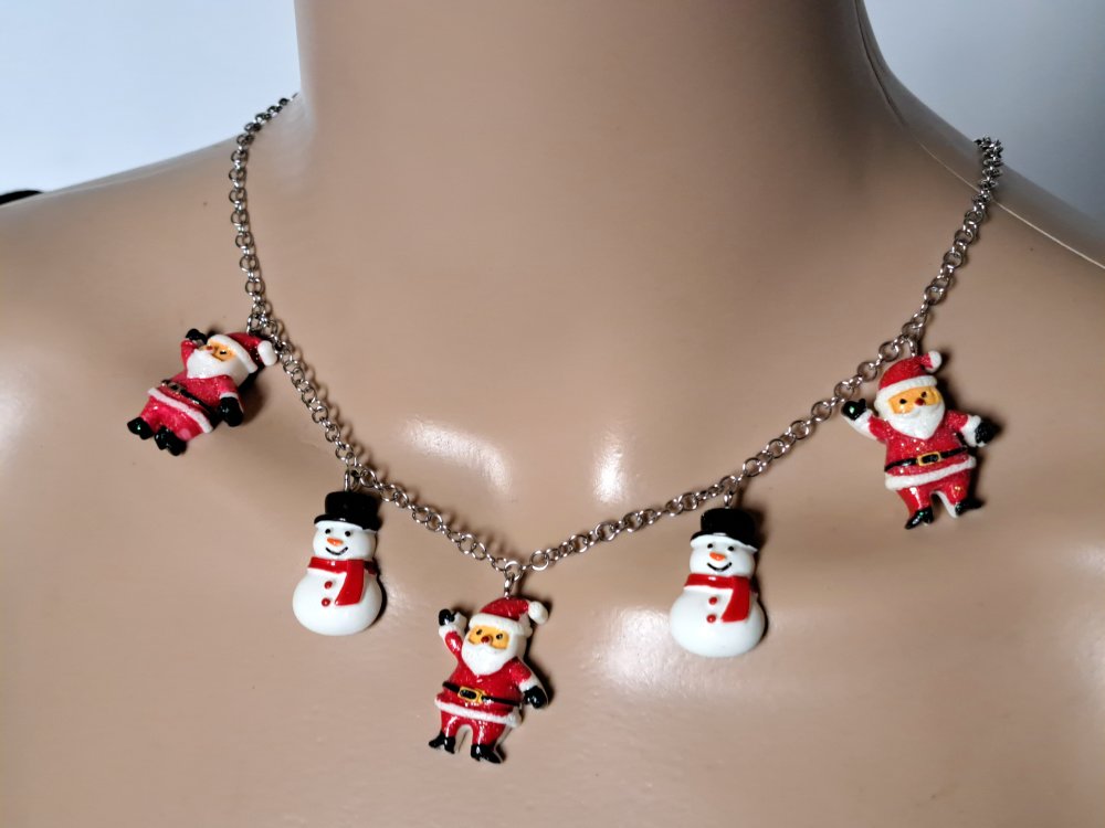 collier père noël, bonhomme de neige en acrylique rouge, blanc, noir fermoir, chaîne en acier inoxydable argenté