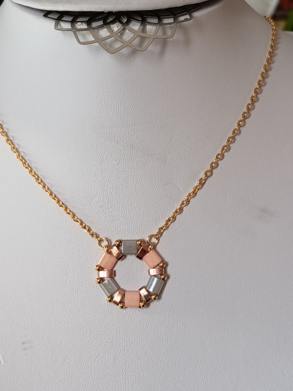 - Collier ras du cou à la main en perles Miyuki Tila et Miyuki Delica. Il mesure 40 cm + 7 cm de chaine d'extension. le tout en acier inoxydable