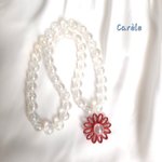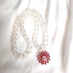 Collier léger monté sur fil de nylon élastique de 50 cm environ ( mi-long ) en perles de plastique transparent avec une fleur en bois peint rouge .