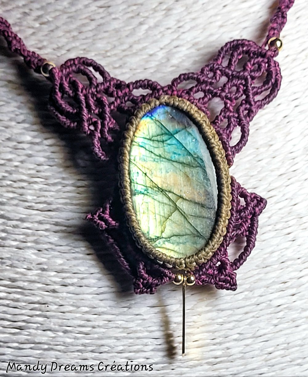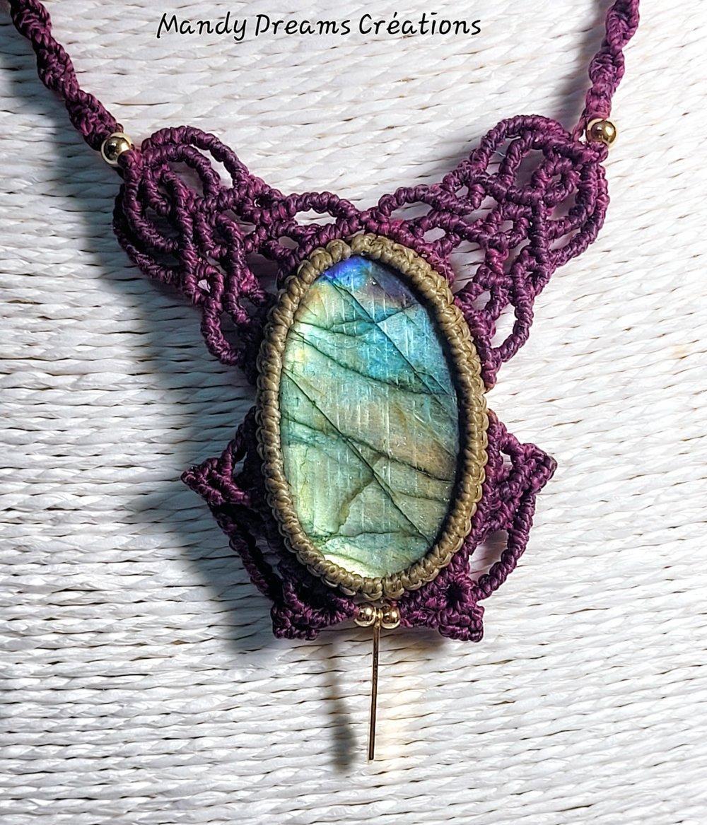 Collier boho chic cerise foncée avec labradorite naturelle sertie avec du micro macramé