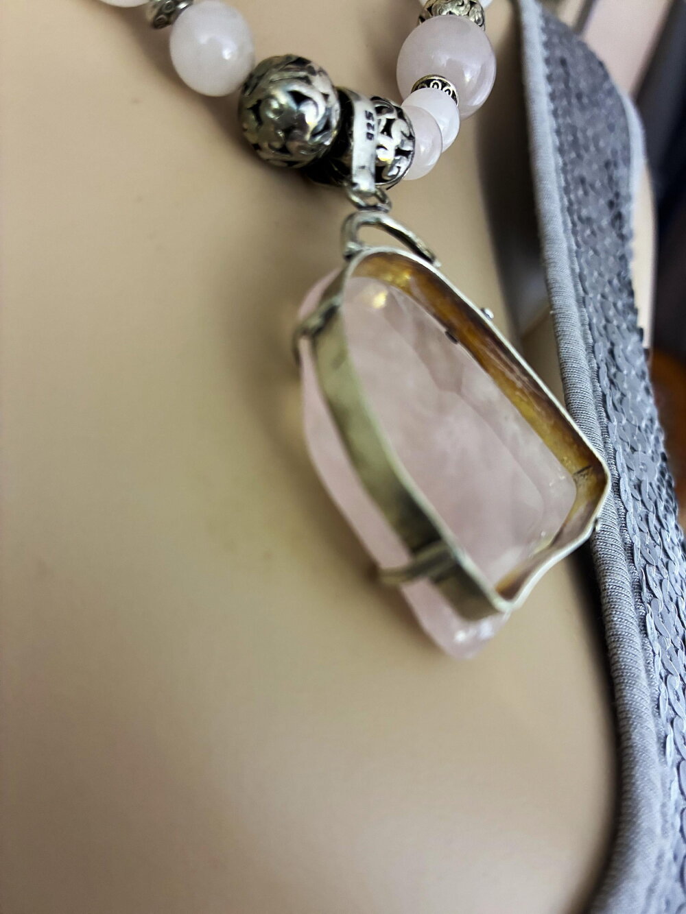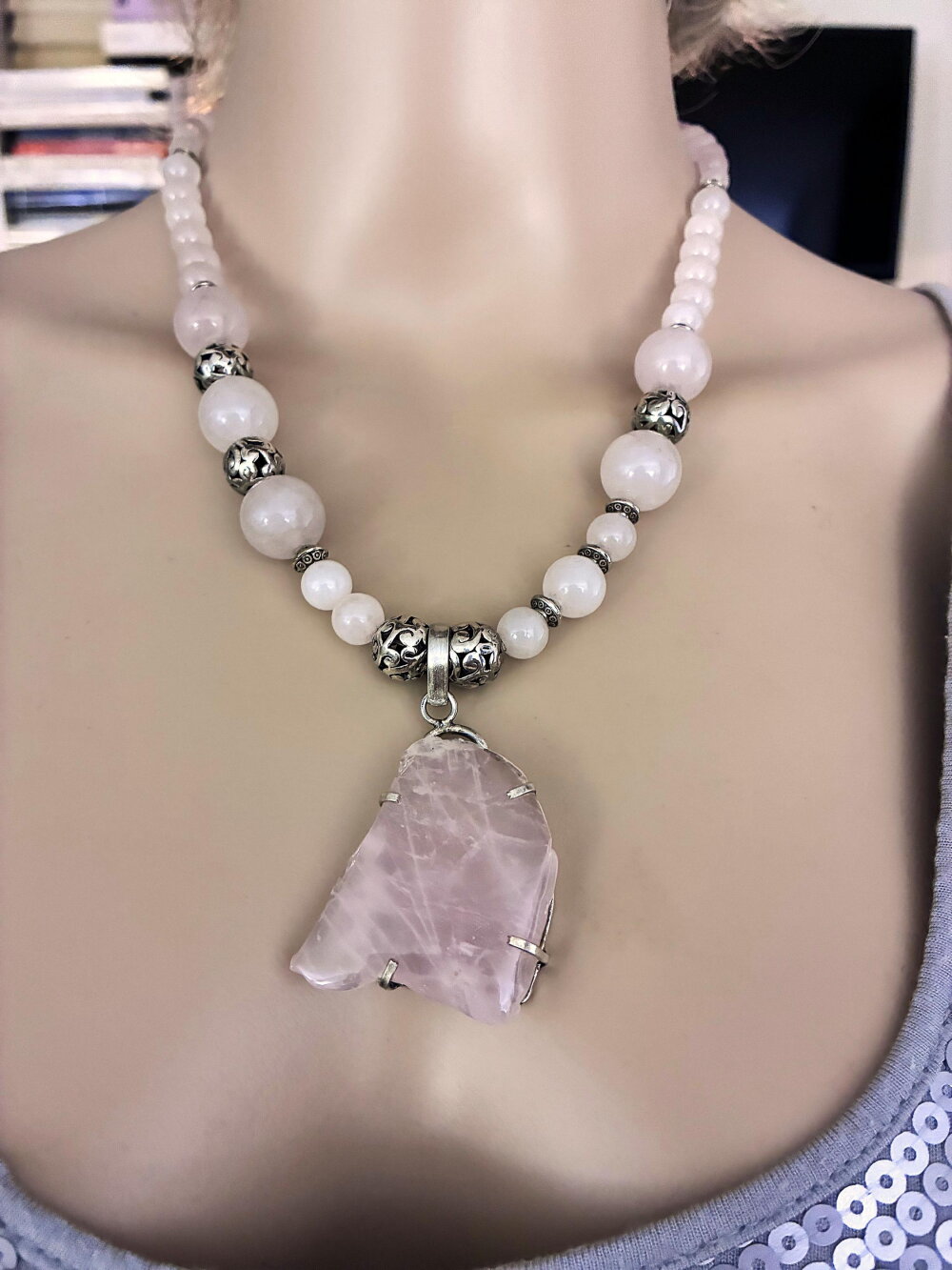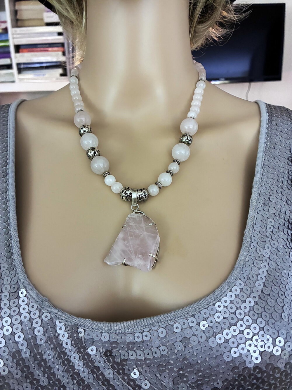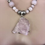 Très joli collier en quartz rose avec superbe pendentif en quartz brut, bijou femme.