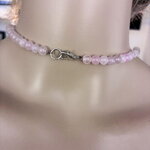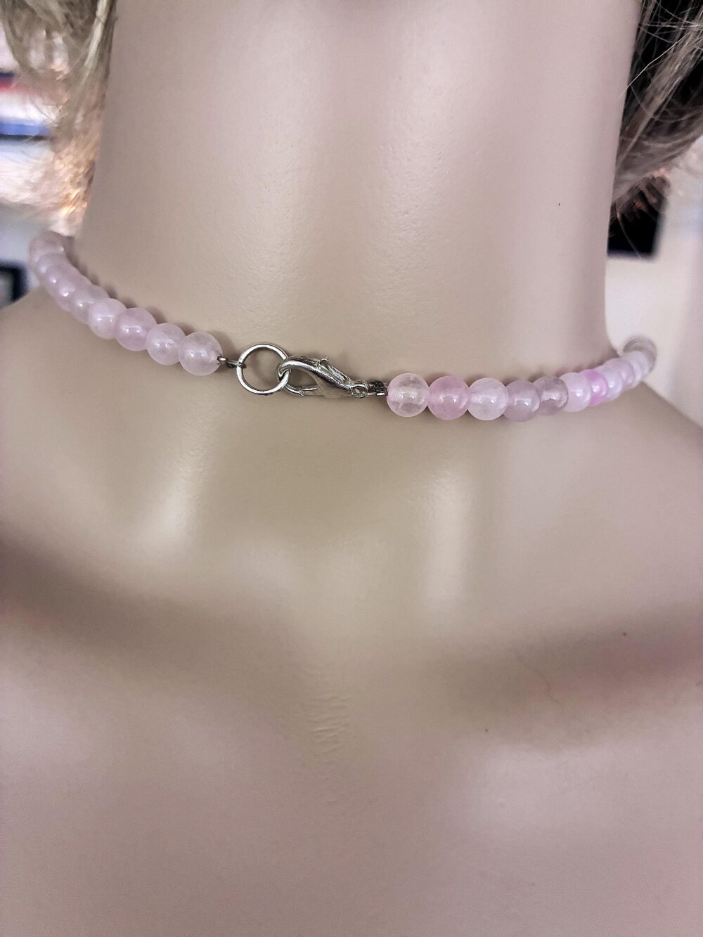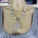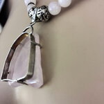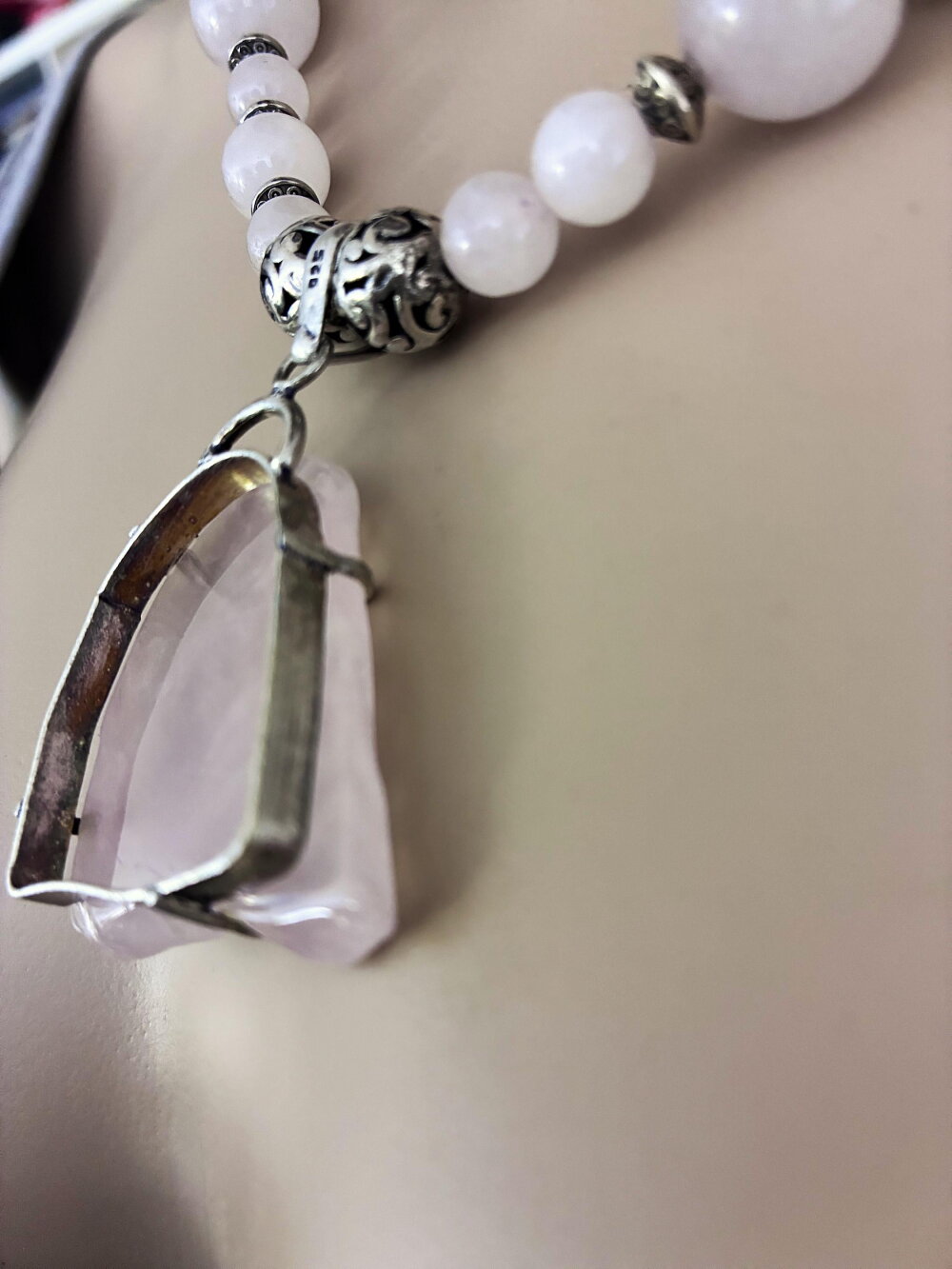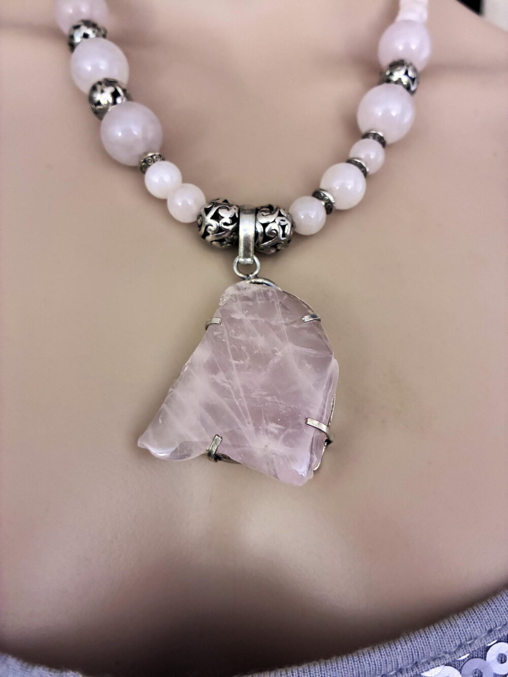 Très joli collier en quartz rose avec superbe pendentif en quartz brut, bijou femme.