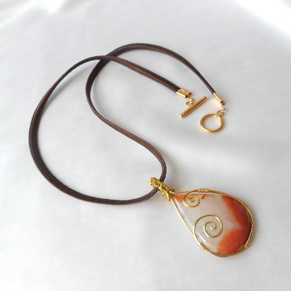Collier en quartz rouge avec fil doré Artistic Wire, cordon en viscose marron et fermoir inox doré. Un bijou audacieux pour illuminer vos tenues!