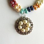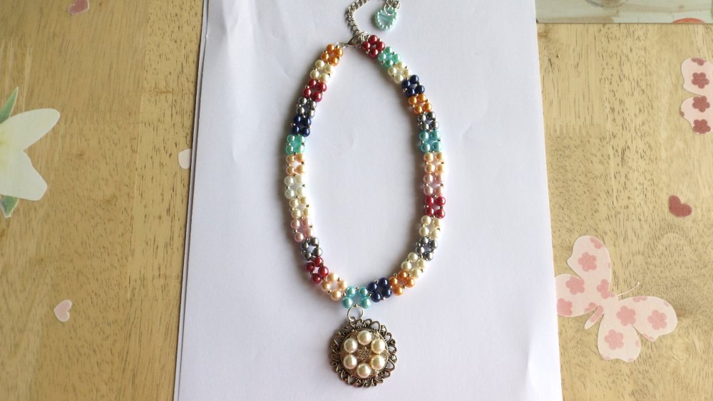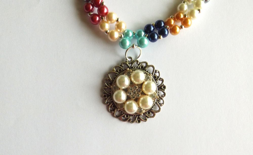 Très joli collier avec des perles en verre et un pendentif magnifiques composé de perles en plastiques et de strass collé sur un support cabochon en métal veilli argenté et d'un fermoir et chaine d'extention en métal argenté.