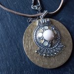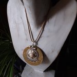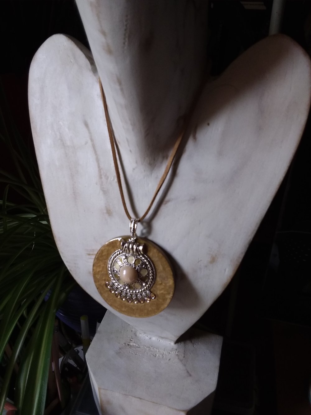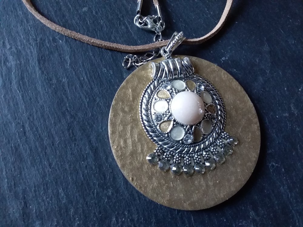 Joli pendentif rond décoré à la main , tons camel et blanc, en bois