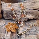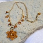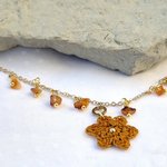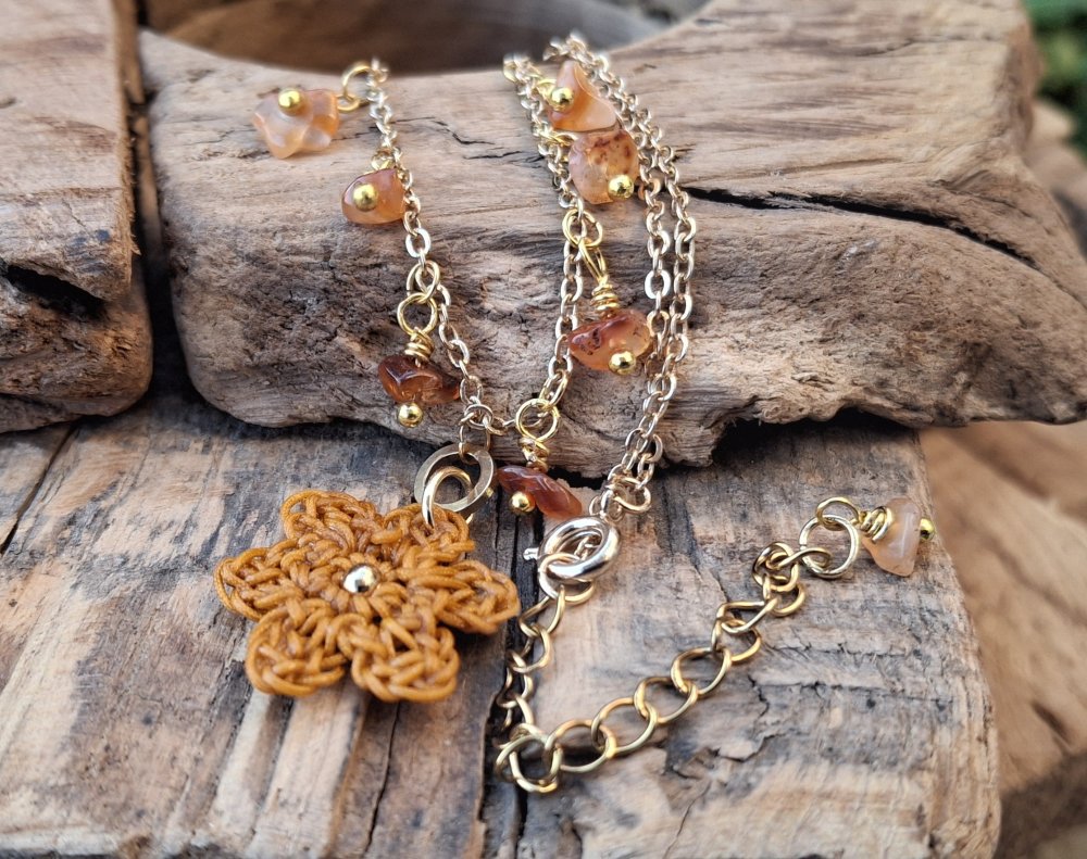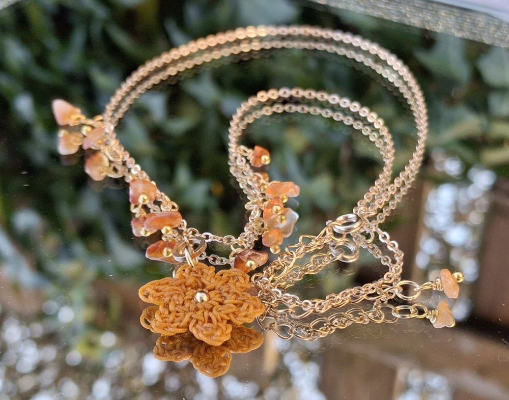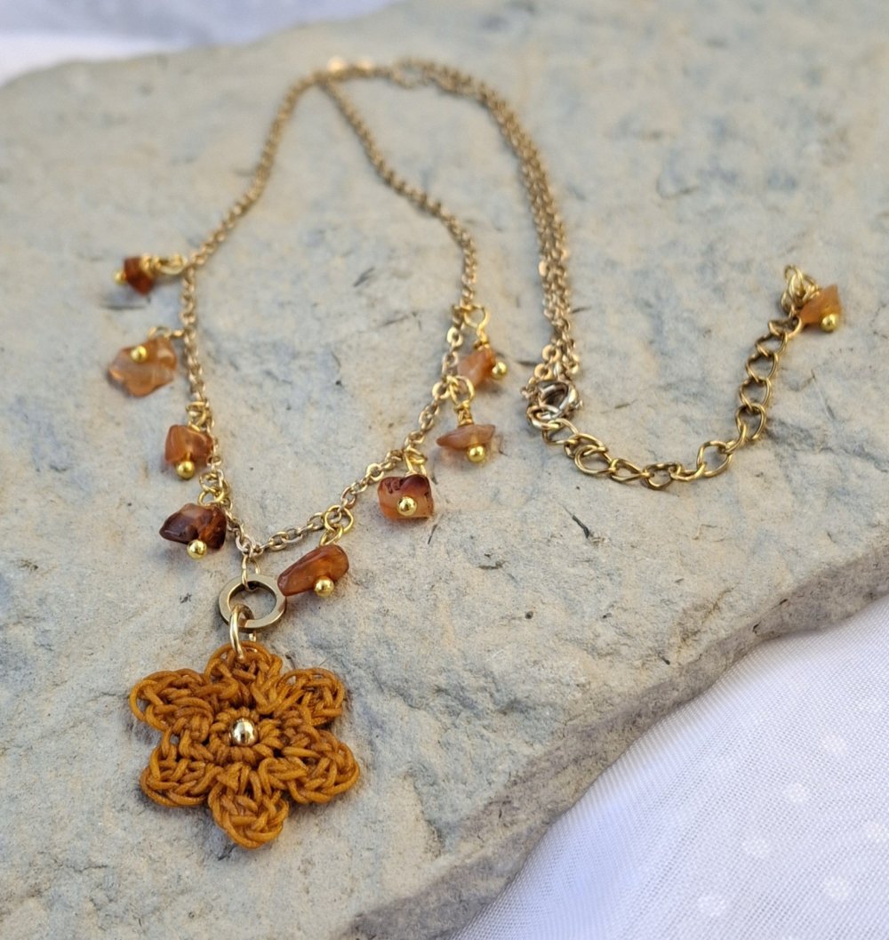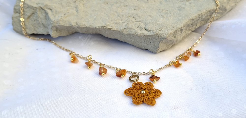 Ce ras du cou délicat met en scène une fleur crochetée à la main au fil de soie (0,5 mm), accompagnée de pampilles en Cornaline naturelle.