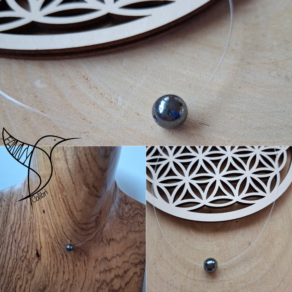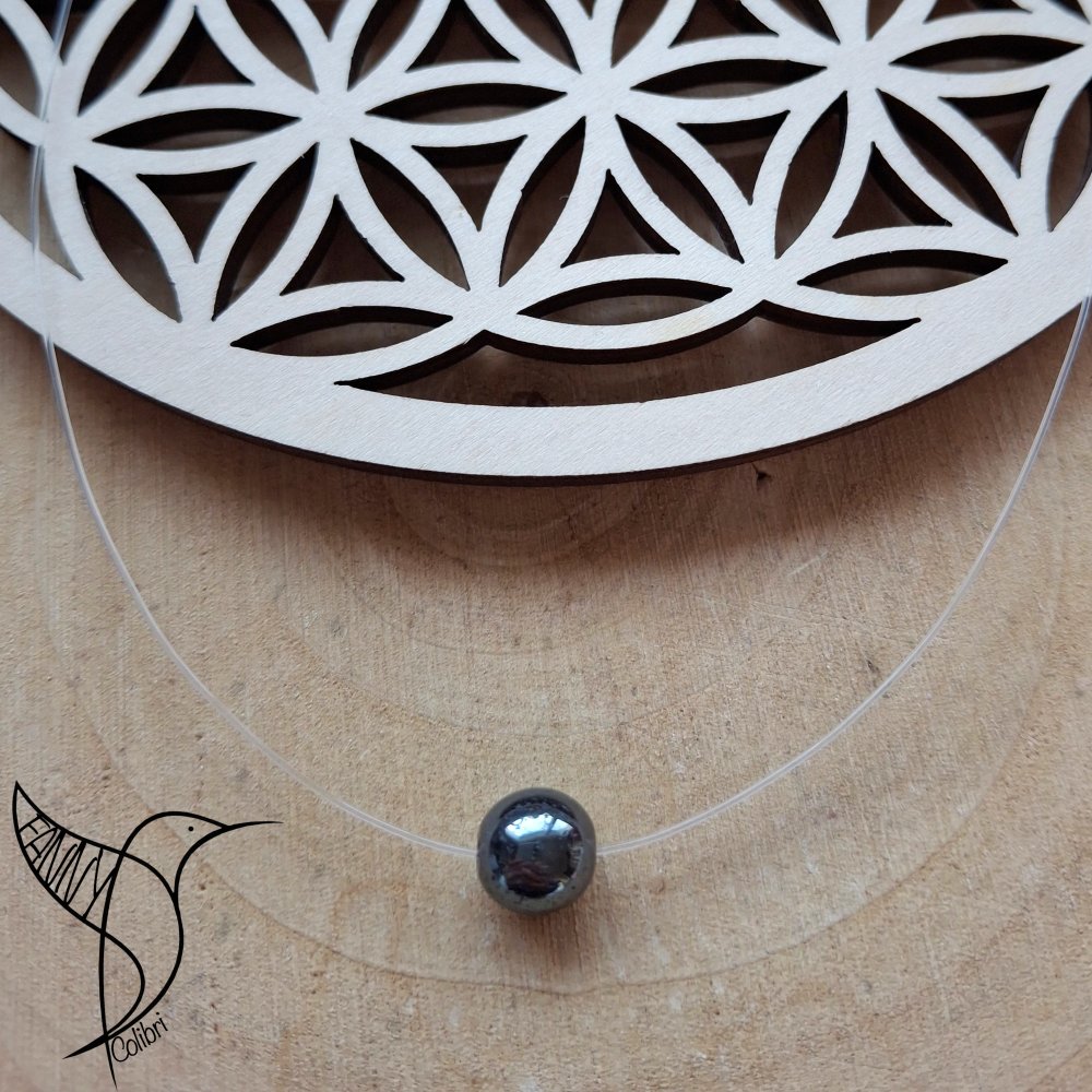 Collier ras du cou discret grâce au fil de nylon. Il est en acier inoxydable, mesure 35/40 cm grâce à une chaîne d'extension et il est composé d'une magnifique perle hématite.
