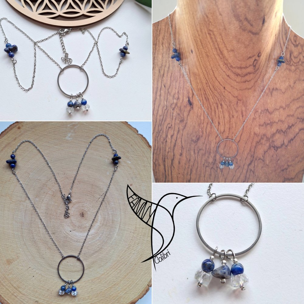 Voici un collier en acier inoxydable. La chaîne mesure 45 à 50 cm grâce à une chaîne d'extension, le pendentif est composé de pierres naturelles (lapis-lazuli et crystal)
