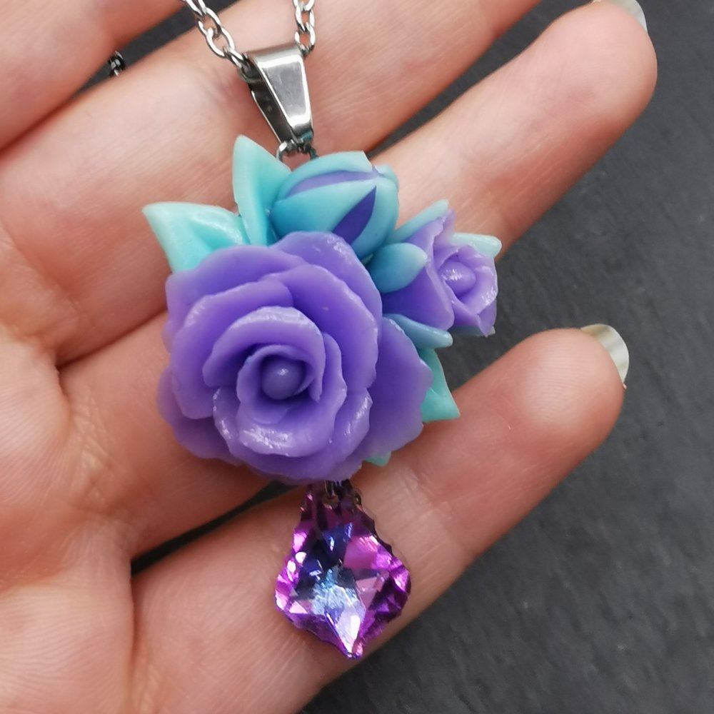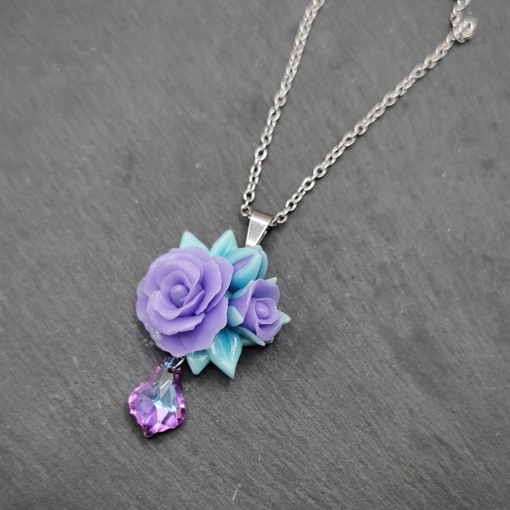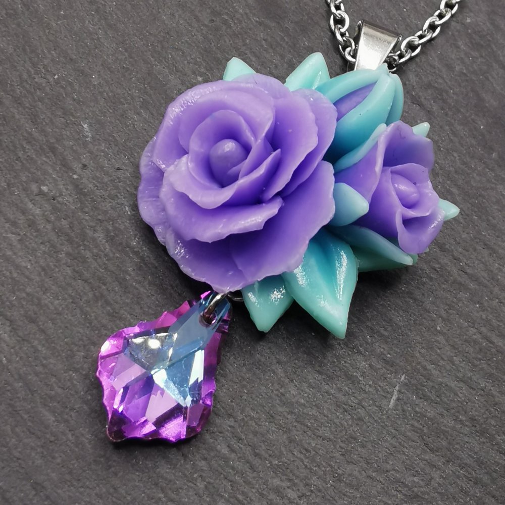 Venez accrochez la reines des fleurs à votre cou avec cet joli pendentifs de roses et de cristal. Ces belles roses mauves viendront parer d'élégance et de grâce votre journée (ou votre soirée !)