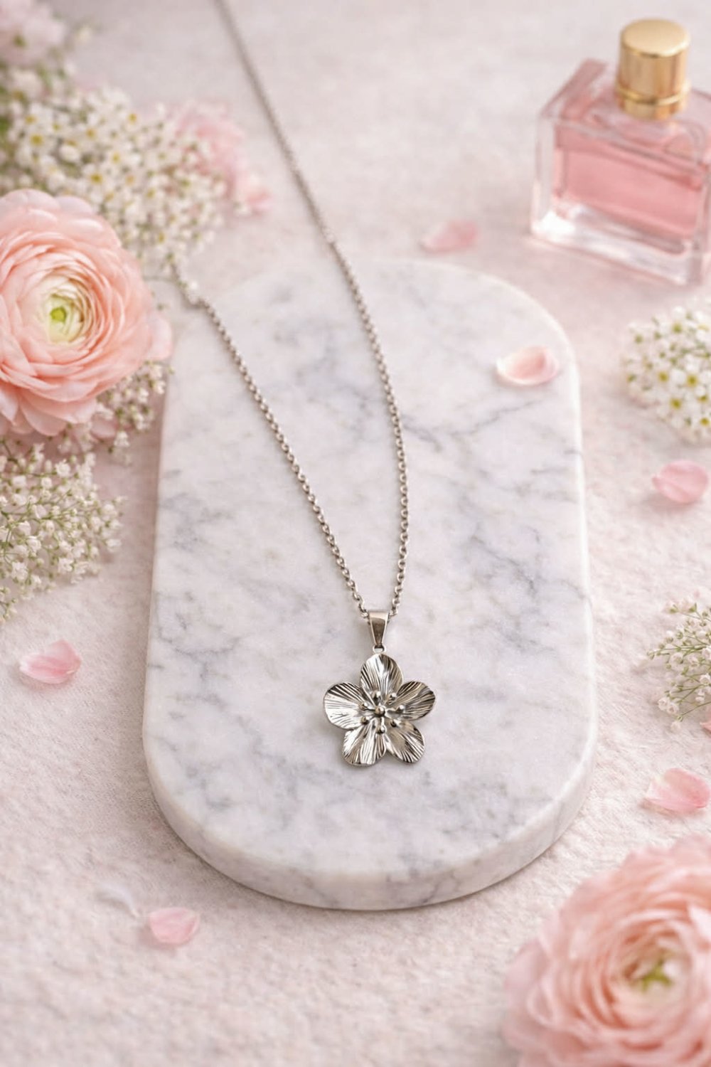 Chaîne en acier inoxydable de 45 cm , bélière en acier inoxydable accompagné de son pendentif fleur en acier inoxydable de 20mm.