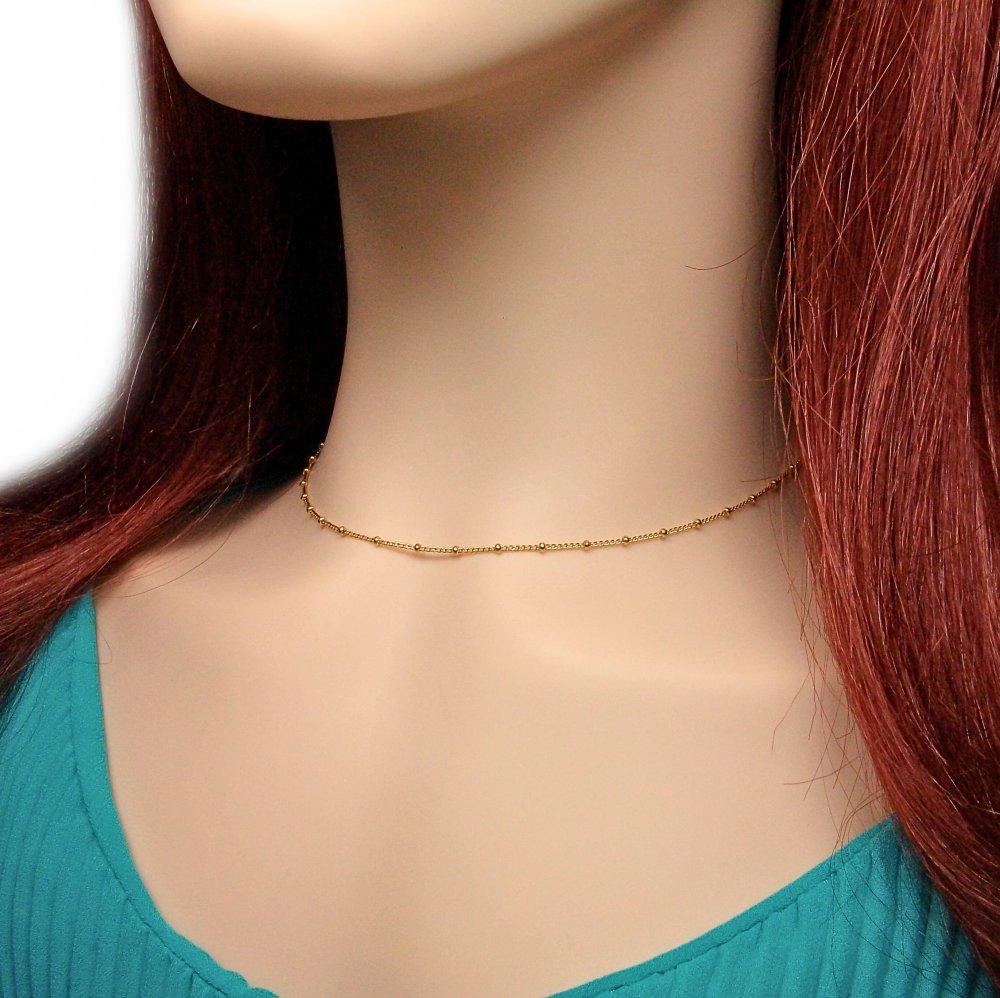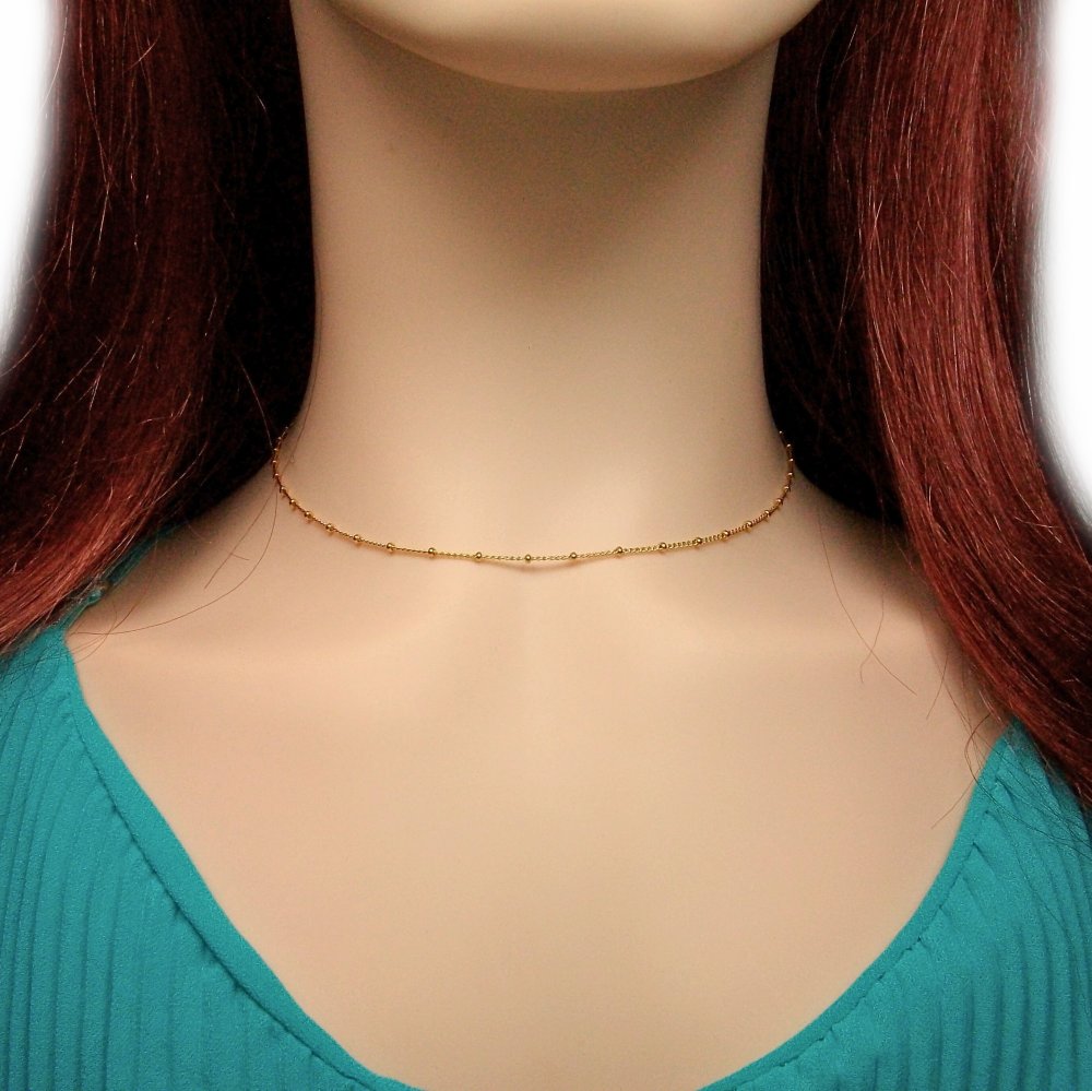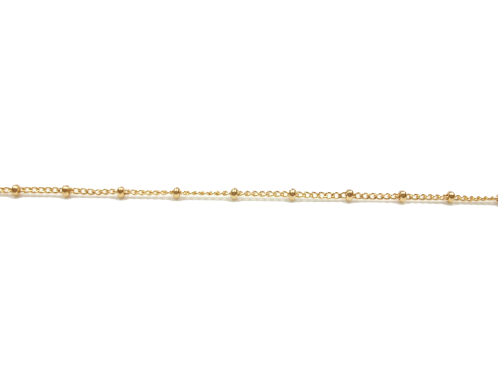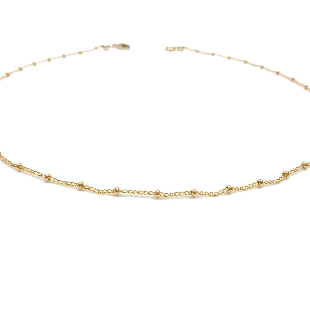 Collier composé d'une chaîne perlée, ses petites billes espacées dessinent un rythme délicat, comme une constellation discrète.