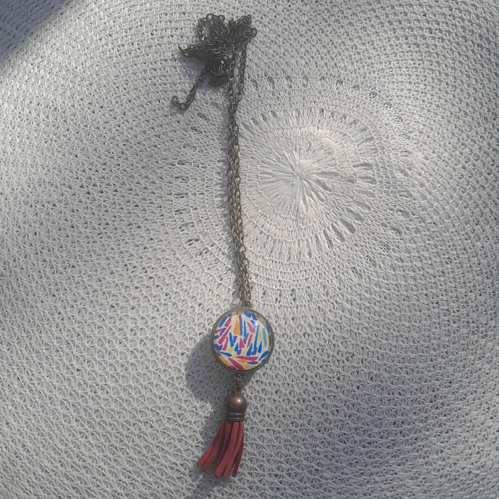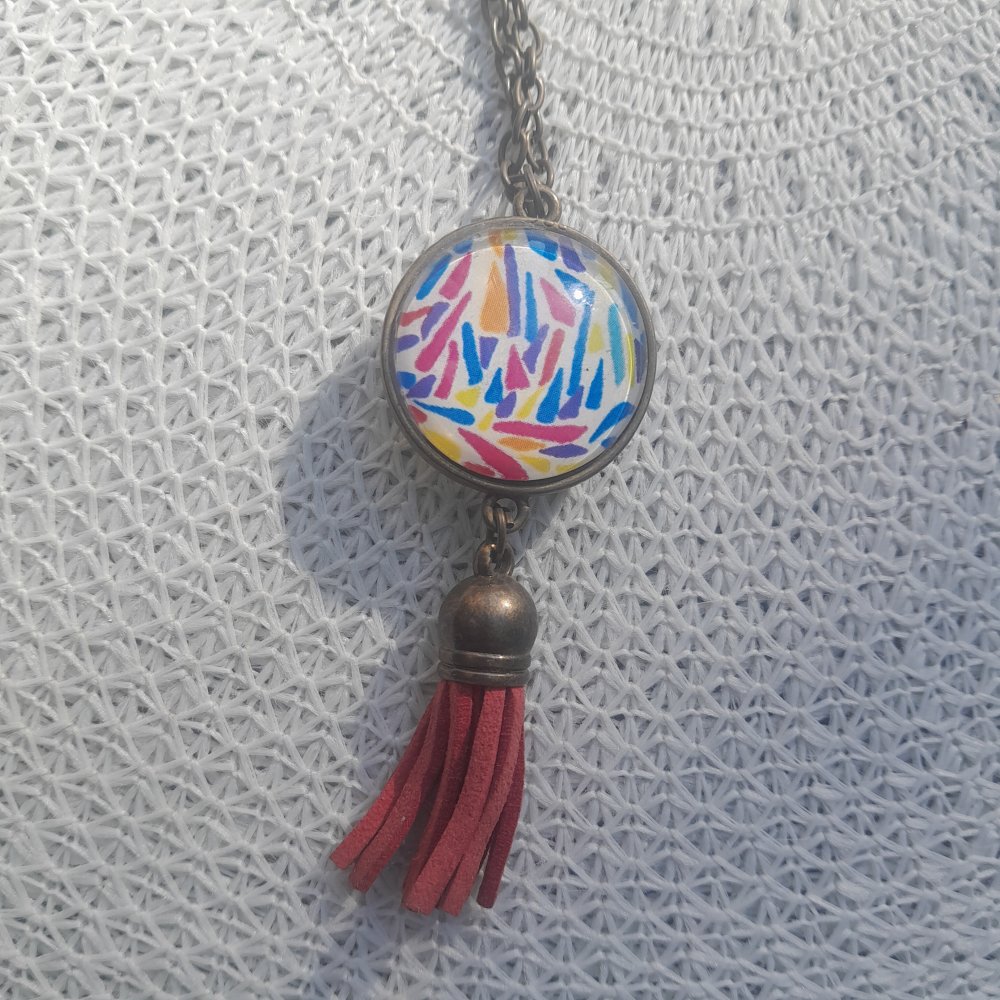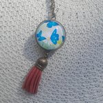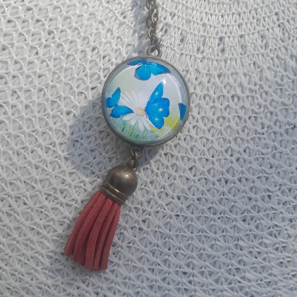 Collier sautoir double face avec une image de papillon d'un côté et multicolore de l'autre côté. Création artisanale unique.