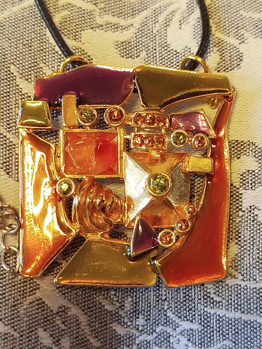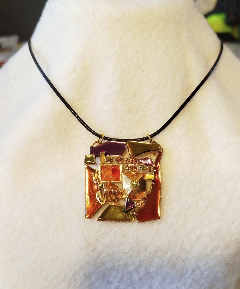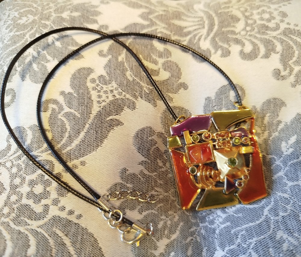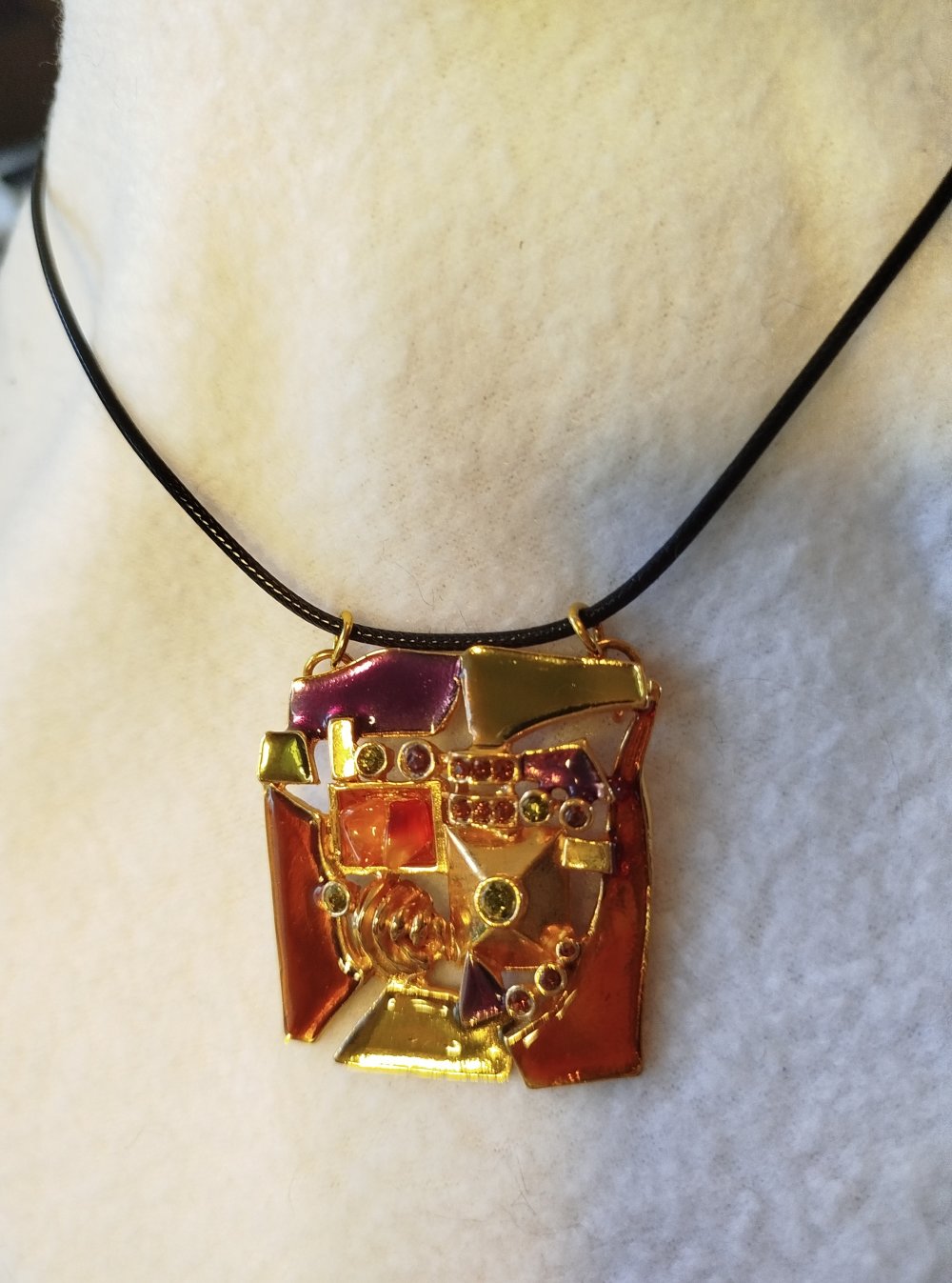 Collier souple : cordon coton enduit et pendentif plaque émaillée violet, vert et orange (émail et brillants)