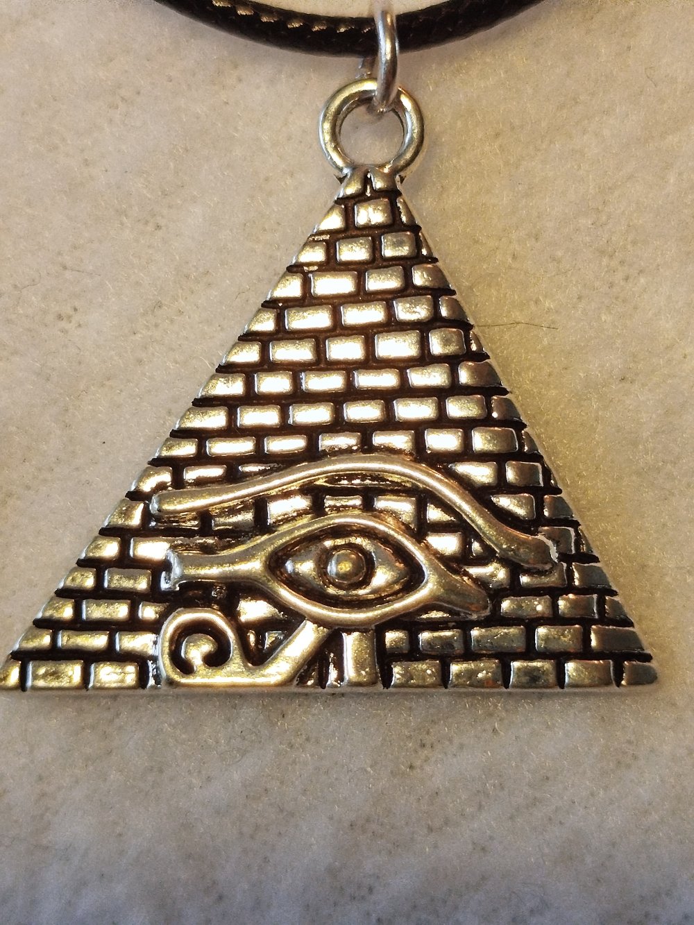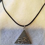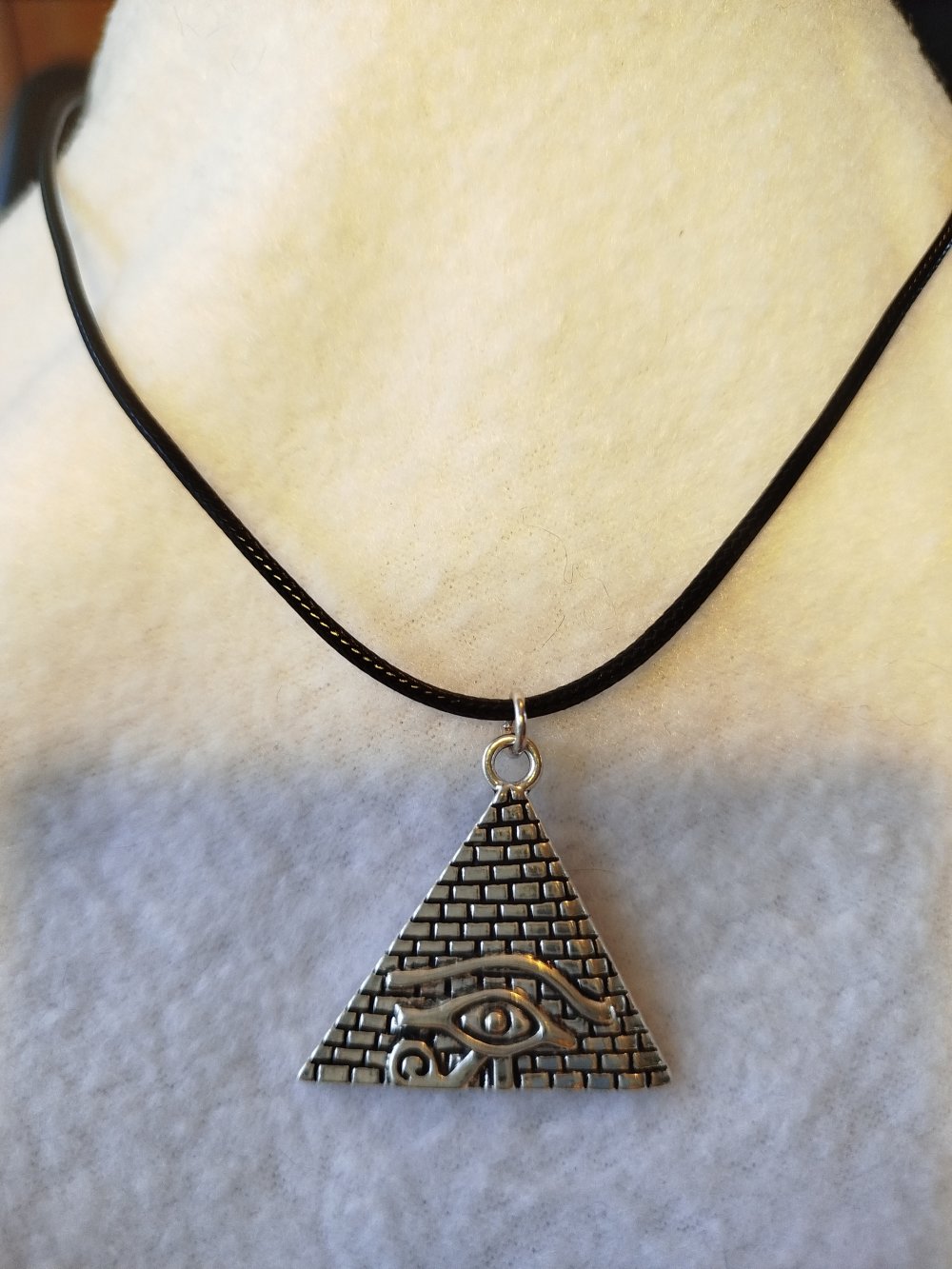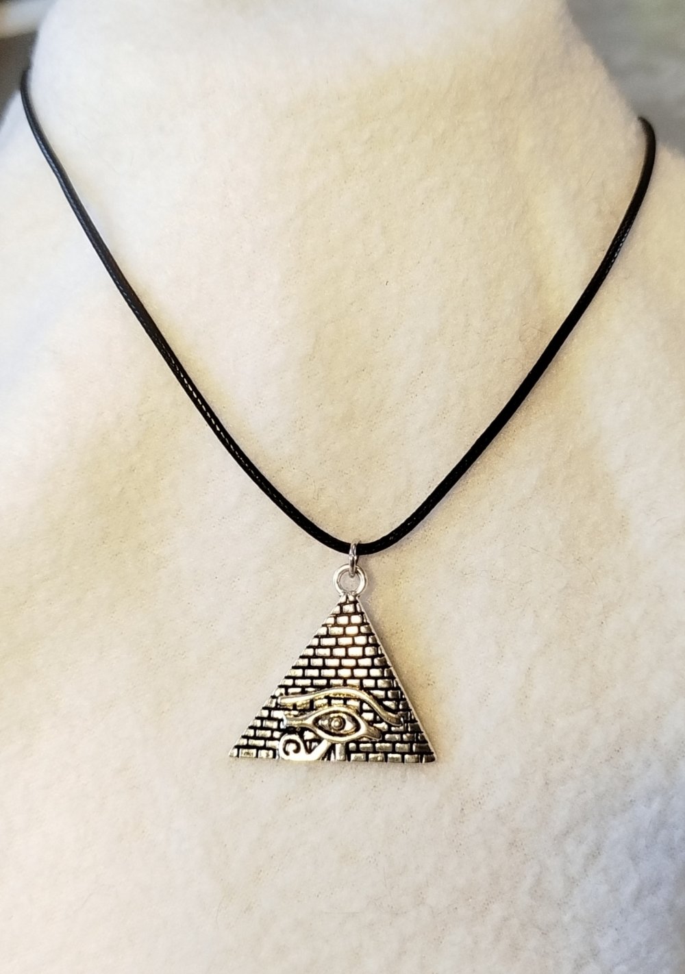 Collier souple : cordon coton enduit et pendentif pyramide et œil d’Horus en métal argenté