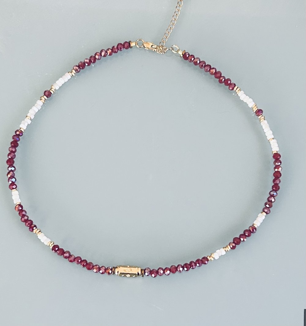 Il est serti d’une amulette dorée à l’or fin, de perles rouges, de perles en nacre blanche et de perles Heishi doré à l'or fin 24k.