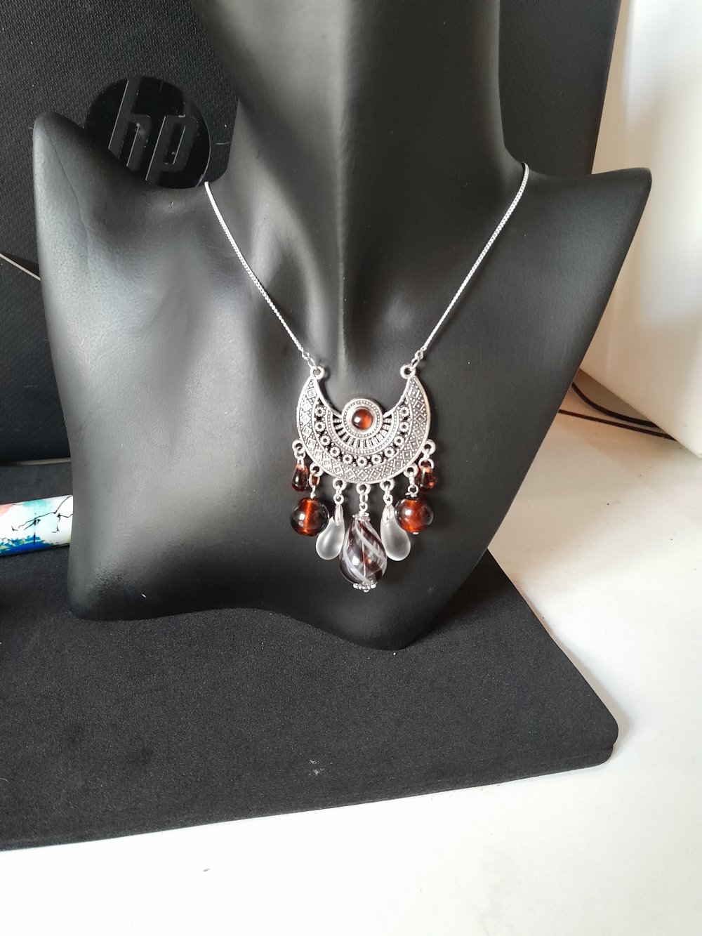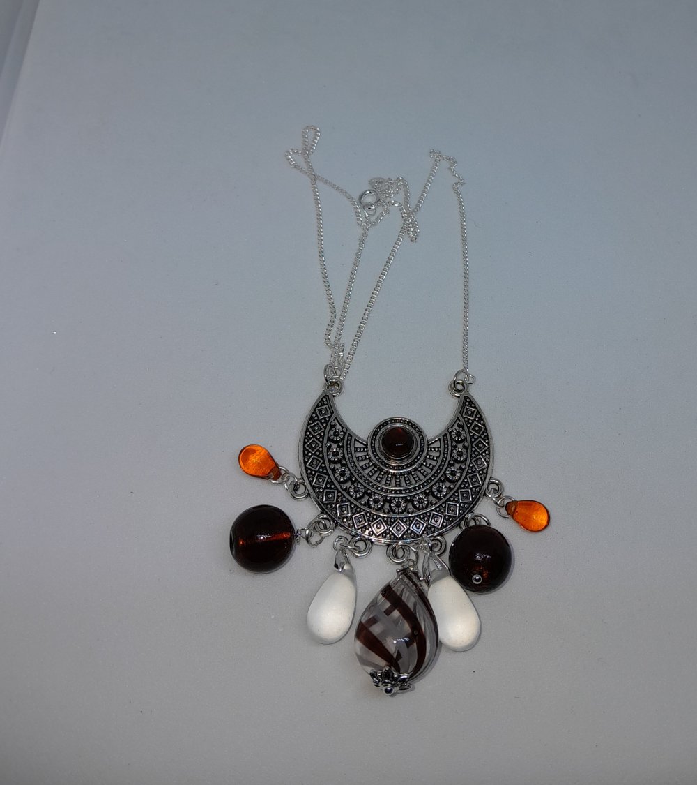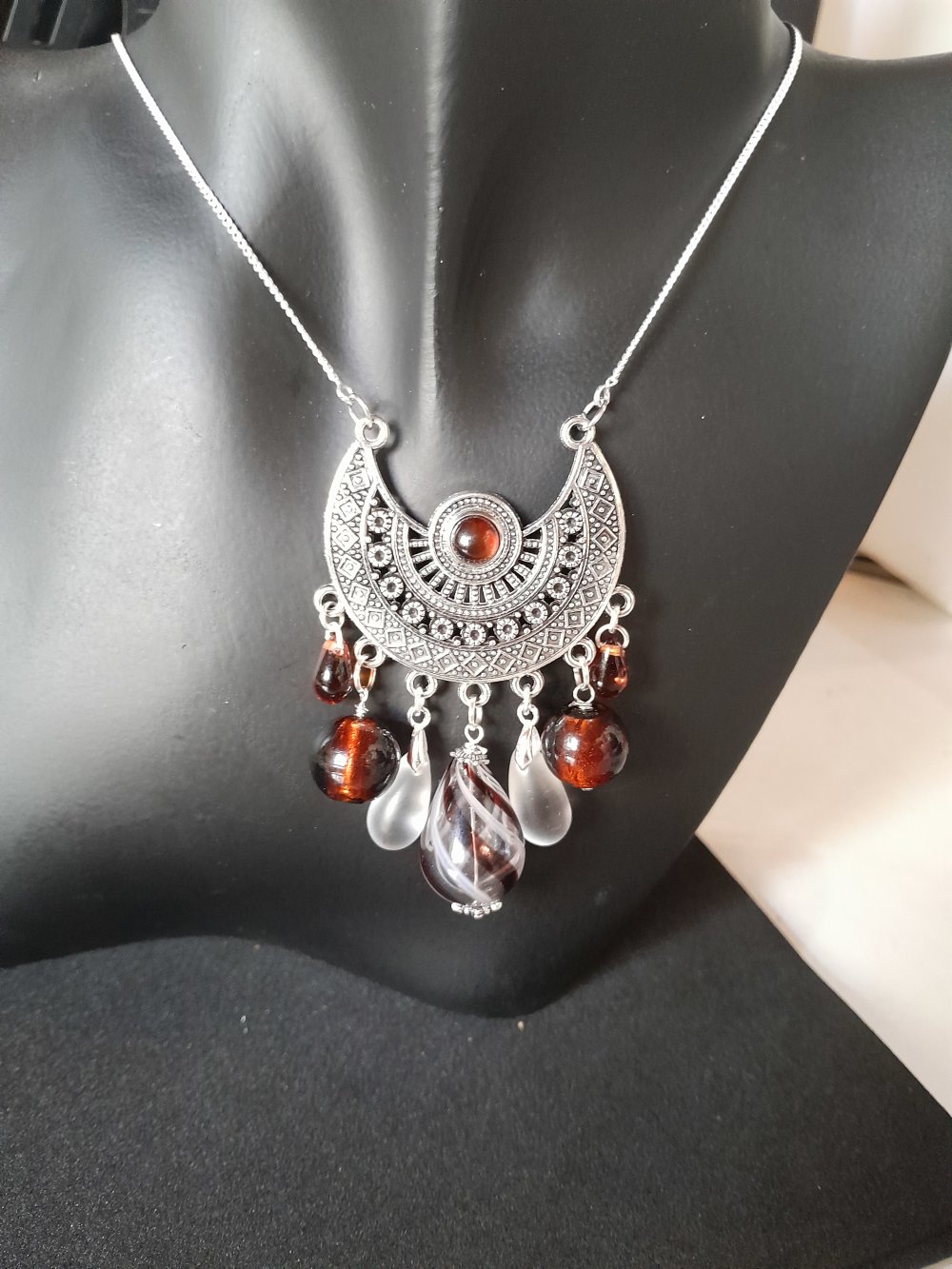 collier en forme de chevron avec 1 quartz fumé 6 mm, 1 perle de verre de Murano 25 mm et 2 perles de verre de Bohème 12 mm, 2 perles de verre de bohème de 12, 2 perles de verre de bohème 6 mm, livré avec chaine en argent 925 sterling de 40 cm.